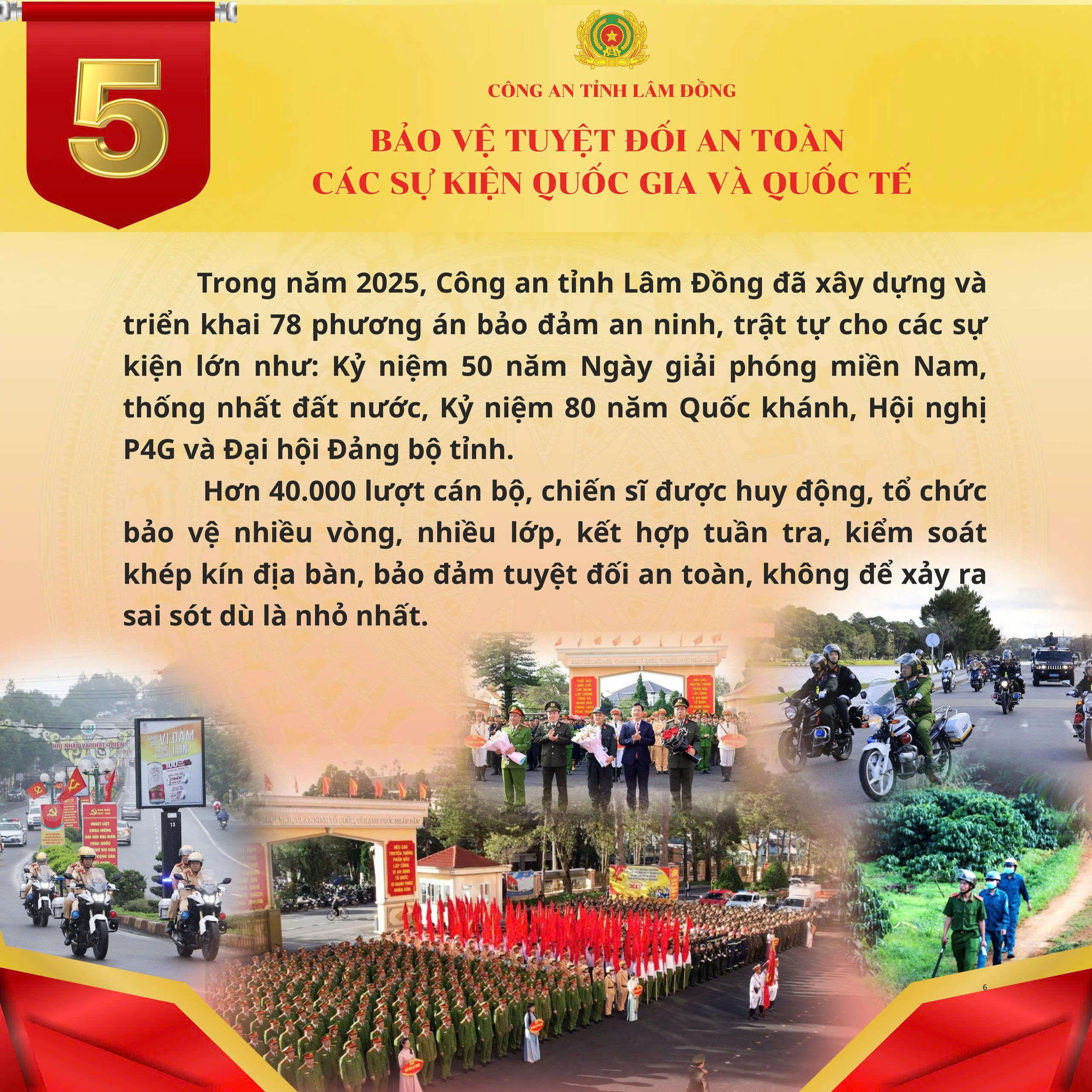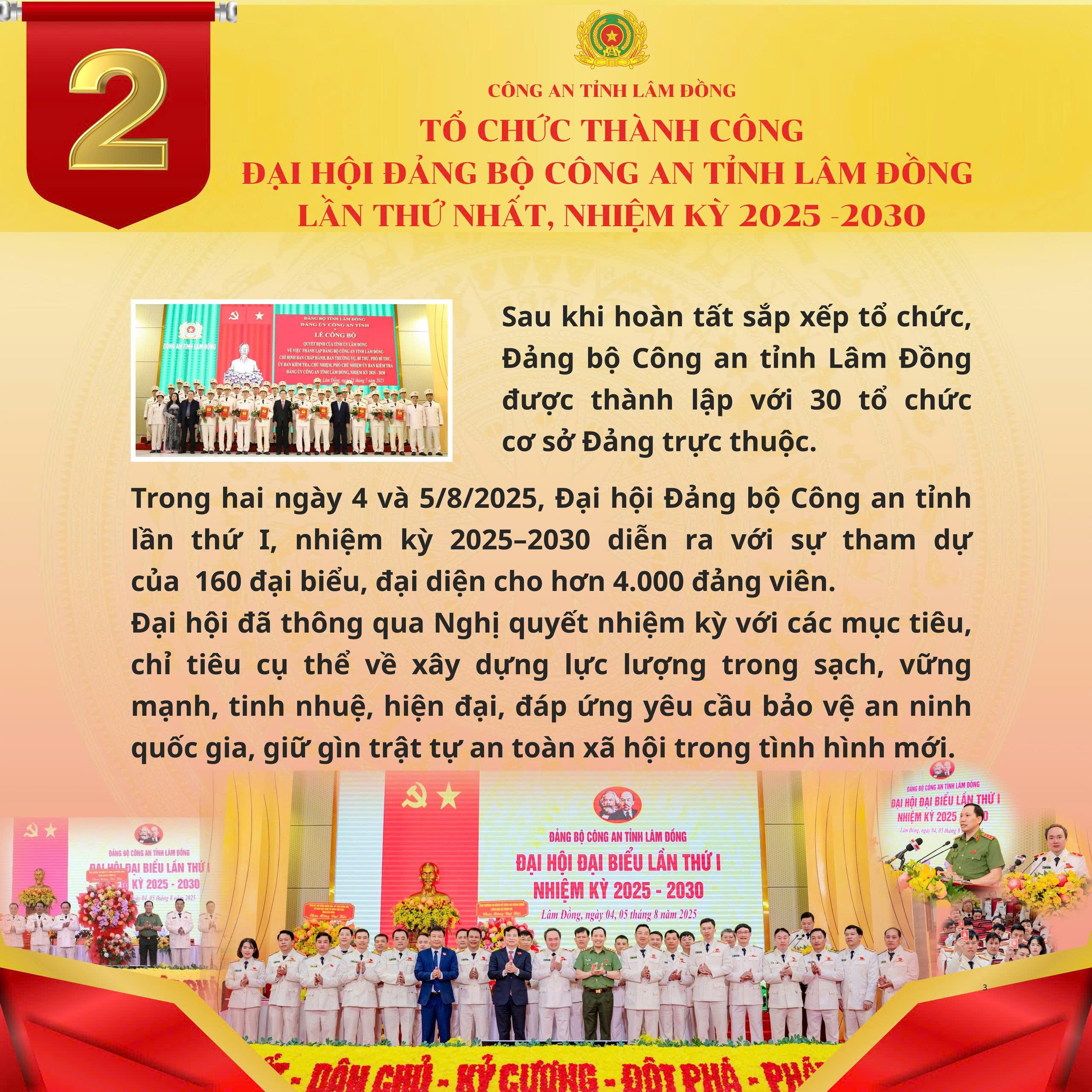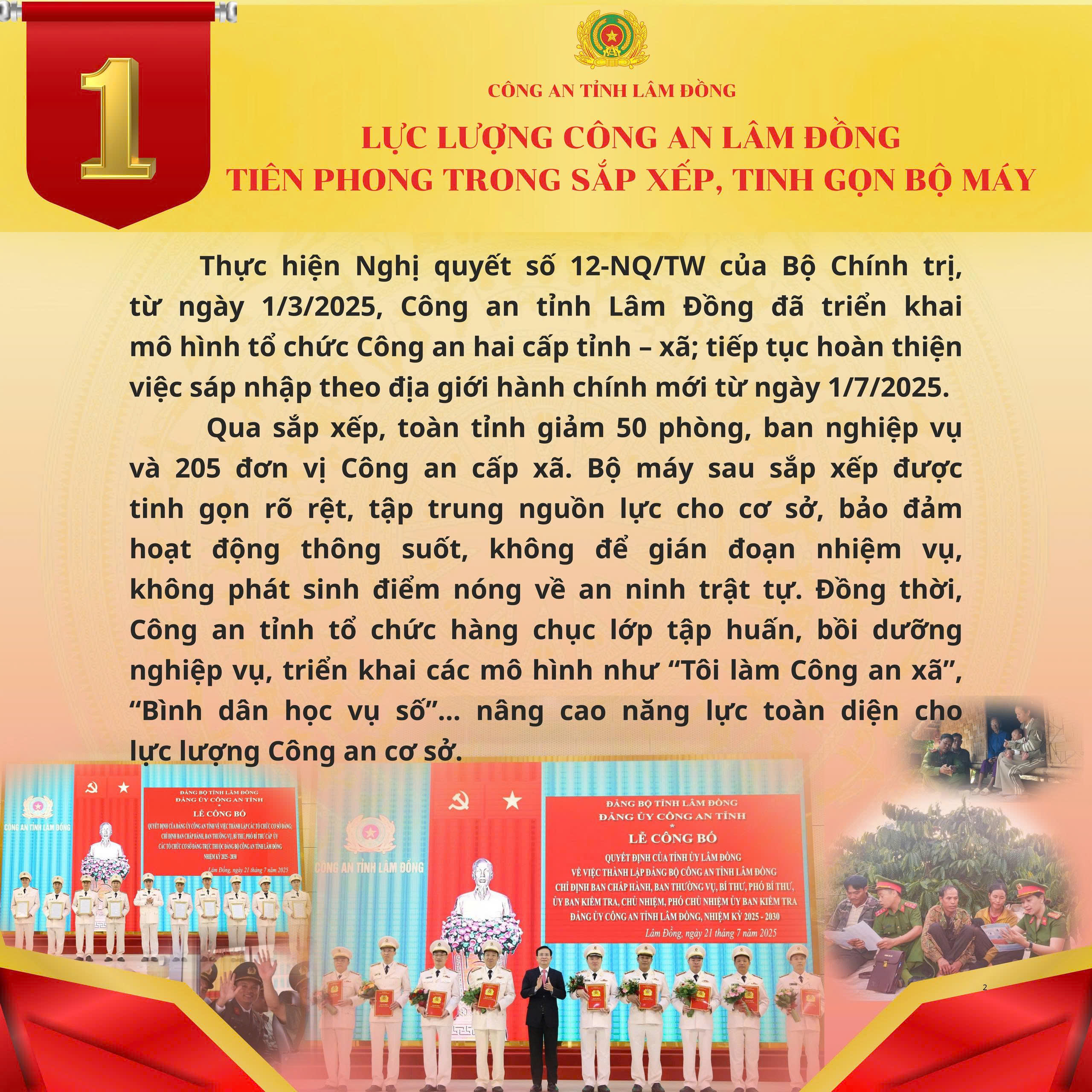 Chỉ đạo - Điều hành 10 Sự kiện nổi bật của Công an Lâm Đồng năm 2025 Your browser does not support the audio element.   25/12/2025 11:20 |   380 |  Năm 2025 là năm có ý nghĩa đặc biệt đối với lực lượng Công an tỉnh Lâm Đồng khi cùng lúc thực hiện nhiều nhiệm vụ lớn, yêu cầu cao, trong bối cảnh tổ chức bộ máy được sắp xếp, kiện toàn theo mô hình mới. Dưới sự lãnh đạo trực tiếp của Đảng ủy Công an Trung ương, lãnh đạo BCA, của Tỉnh ủy, HĐND và UBND tỉnh, toàn lực lượng Công an Lâm Đồng đã nêu cao tinh thần trách nhiệm, đoàn kết, chủ động triển khai đồng bộ các mặt công tác, hoàn thành xuất sắc nhiệm vụ chính trị được giao, giữ vững ổn định an ninh trật tự, phục vụ hiệu quả sự phát triển kinh tế – xã hội của địa phương. Thực hiện: Nhật Minh