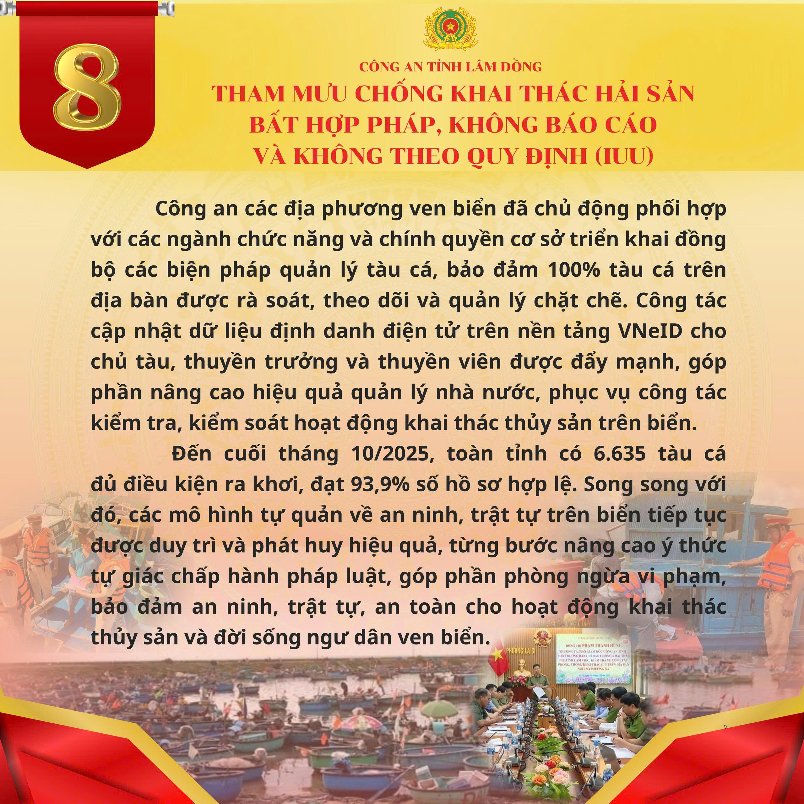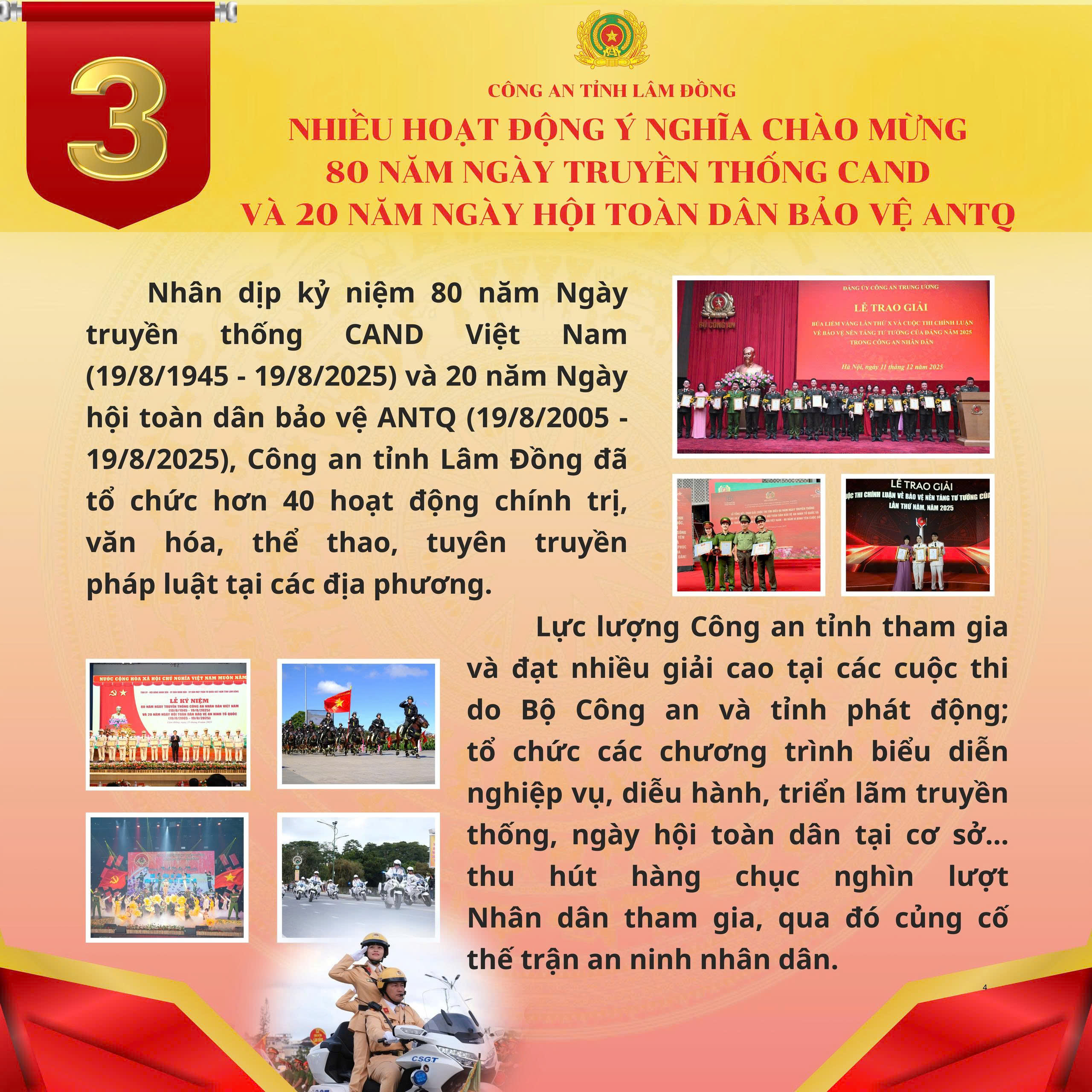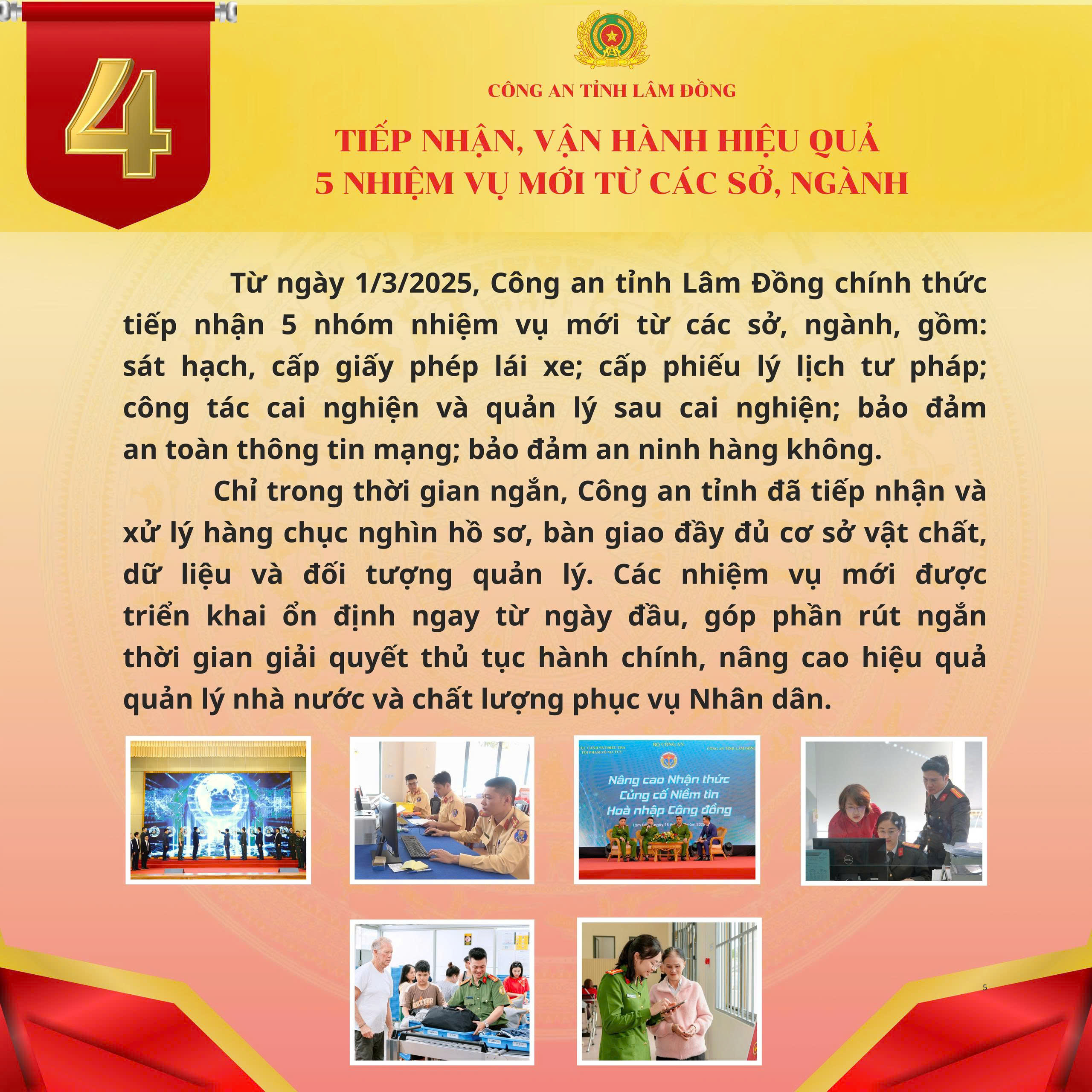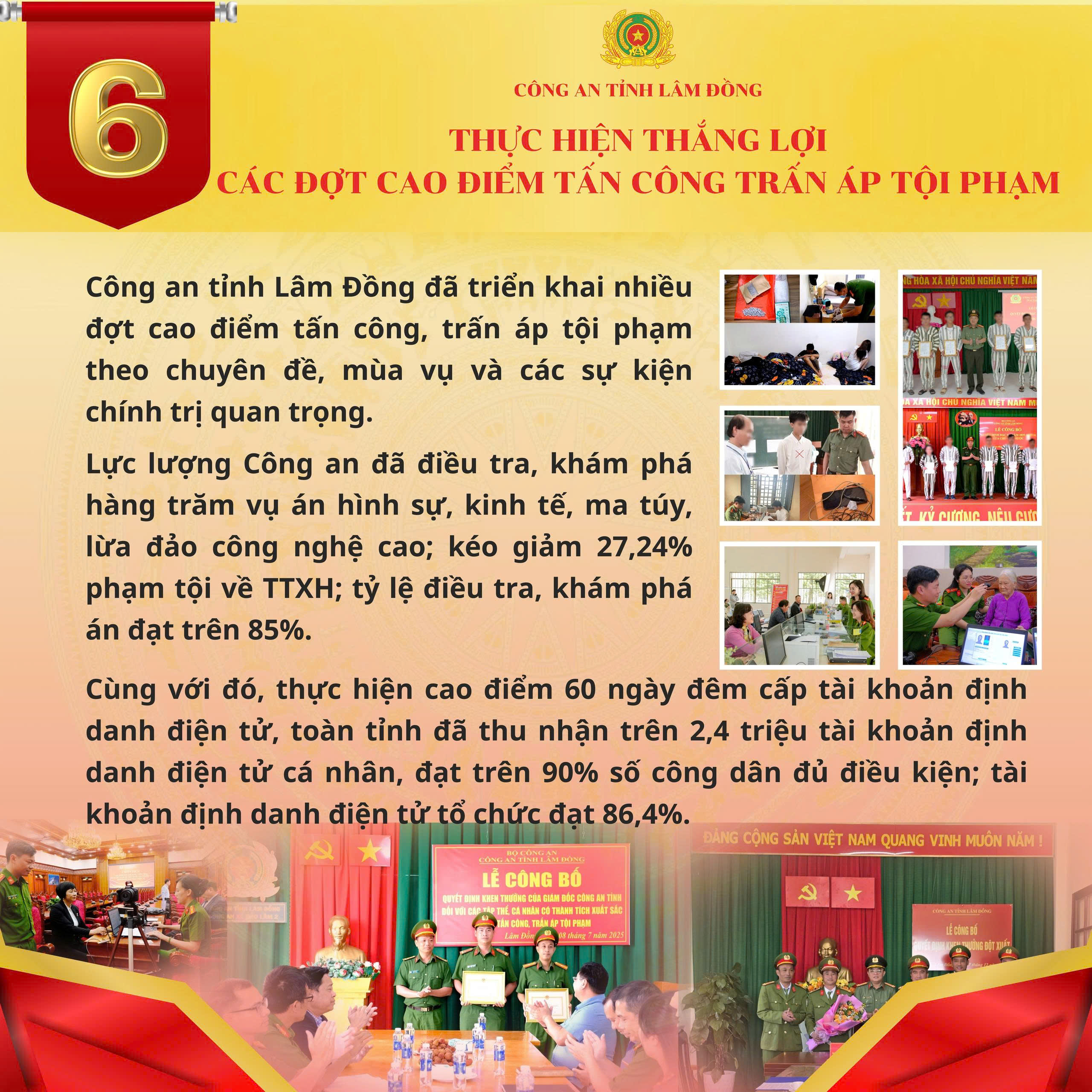 Chỉ đạo - Điều hành 10 Sự kiện nổi bật của Công an Lâm Đồng năm 2025 Your browser does not support the audio element.   25/12/2025 11:20 |   380 |  Năm 2025 là năm có ý nghĩa đặc biệt đối với lực lượng Công an tỉnh Lâm Đồng khi cùng lúc thực hiện nhiều nhiệm vụ lớn, yêu cầu cao, trong bối cảnh tổ chức bộ máy được sắp xếp, kiện toàn theo mô hình mới. Dưới sự lãnh đạo trực tiếp của Đảng ủy Công an Trung ương, lãnh đạo BCA, của Tỉnh ủy, HĐND và UBND tỉnh, toàn lực lượng Công an Lâm Đồng đã nêu cao tinh thần trách nhiệm, đoàn kết, chủ động triển khai đồng bộ các mặt công tác, hoàn thành xuất sắc nhiệm vụ chính trị được giao, giữ vững ổn định an ninh trật tự, phục vụ hiệu quả sự phát triển kinh tế – xã hội của địa phương. Thực hiện: Nhật Minh