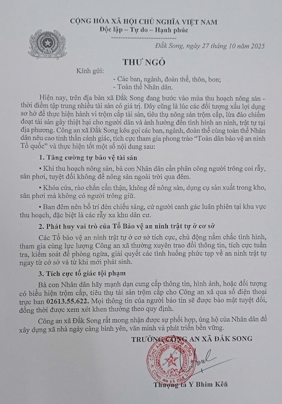 Tìm kiếm thông tin Chọn Tin mới Giới thiệu --Giới thiệu chung --Lịch sử phát triển --Lãnh đạo Công an tỉnh Chỉ đạo - Điều hành --Của lãnh đạo Bộ Công an --Của Lãnh đạo Công an tỉnh Tin tức - Sự kiện --Hoạt động của Bộ Công an --Hoạt động của Công an tỉnh --Hoạt động của Công an các đơn vị, địa phương --Các hoạt động an sinh xã hội --An ninh, trật tự Thông tin chuyên đề --Cảnh báo tội phạm --Chính trị - Xây dựng Đảng --Hướng dẫn tố giác tội phạm --Quản lý nhà nước về an ninh, trật tự --Đề án 06 - Chuyển đổi số - Dịch vụ công --Phòng cháy, chữa cháy và cứu nạn, cứu hộ --Bảo đảm trật tự, an toàn giao thông --Phong trào toàn dân bảo vệ ANTQ --Người tốt, việc tốt --Tổng hợp - Thống kê Đấu tranh phản bác Phổ biến, giáo dục pháp luật Phản ánh - Kiến nghị Thông báo Thông tin cần biết --Tuyển chọn công dân vào CAND --Tuyển chọn lao động hợp đồng --Hướng dẫn xử lý vi phạm hành chính --Thông tin truy nã, truy tìm --Tuyển sinh Công an nhân dân Văn bản Liên hệ Tin Media Lịch tiếp công dân Tất cảTiêu đề bài viếtNội dung Tìm kiếm Tìm thấy : 28 bài viết Công an xã Đắk Song tích cực làm sạch dữ liệu đăng ký xe, hướng tới nền hành chính số minh bạch, hiện đại  10:54 10/12/2025 |   114 Thực hiện chỉ đạo của Công an tỉnh Lâm Đồng về công tác làm sạch dữ liệu đăng ký phương tiện và giấy phép lái xe, thời gian qua Công an xã Đắk Song đã triển khai đồng bộ nhiều giải pháp rà soát, đối chiếu, cập nhật và số hóa dữ liệu theo phương châm “gần dân – sát dân – đi từng ngõ, gõ từng nhà”, bảo đảm thông tin phương tiện “đúng – đủ – sạch – sống”. Ra mắt Chi hội Cựu CAND xã Đắk Song  10:13 26/11/2025 |   59 Ngày 25/11/2025, Hội Cựu Công an nhân dân tỉnh Lâm Đồng phối hợp với Công an xã Đắk Song tổ chức Lễ công bố Quyết định thành lập Chi hội và chỉ định Chi hội trưởng, Chi hội phó Chi hội Cựu CAND xã Đắk Song. Công an xã Đắk Song tăng cường tuyên truyền, vận động thu gom vũ khí, vật liệu nổ, công cụ hỗ trợ và pháo  10:51 06/11/2025 |   246 Thực hiện kế hoạch của Công an tỉnh Lâm Đồng về tăng cường công tác quản lý vũ khí, vật liệu nổ, công cụ hỗ trợ (VK - VLN - CCHT) và pháo, Công an xã Đắk Song thời gian qua đã ra quân, chủ động triển khai các biện pháp nghiệp vụ kết hợp tuyên truyền, vận động nhân dân thu gom, tự nguyện giao nộp các loại VK, VLN, CCHT và pháo. Công an xã Đắk Song gửi thư ngỏ kêu gọi người dân phòng ngừa tội phạm trong mùa thu hoạch nông sản  10:43 05/11/2025 |   170 Để chủ động phòng ngừa và đấu tranh có hiệu quả với tội phạm, vi phạm pháp luật, góp phần bảo đảm an ninh, trật tự trong mùa thu hoạch nông sản, Công an xã Đắk Song, tỉnh Lâm Đồng đã phát hành thư ngỏ gửi đến toàn thể Nhân dân trên địa bàn, kêu gọi người dân nêu cao tinh thần cảnh giác, chủ động phòng ngừa và tích cực phối hợp với lực lượng Công an trong công tác đấu tranh, ngăn chặn các loại tội phạm, vi phạm pháp luật có thể phát sinh trong mùa thu hoạch nông sản. Công an xã Đắk Song giữ bình yên mùa thu hoạch nông sản 2025  09:59 04/11/2025 |   130 Hằng năm, cứ đến mùa thu hoạch cà phê và các loại nông sản, tỉnh Lâm Đồng nói chung, xã Đắk Song nói riêng lại thu hút nhiều lao động từ khắp nơi đổ về làm thuê, thu hoạch nông sản. Đây cũng là thời điểm kẻ xấu thường lợi dụng, trà trộn để hoạt động. Để giúp người dân yên tâm sản xuất, lực lượng Công an xã Đắk Song đã chủ động triển khai đồng bộ, quyết liệt nhiều biện pháp bảo đảm an ninh, trật tự (ANTT), phòng, chống tội phạm, ngăn chặn hiệu quả tình trạng trộm cắp cà phê và nông sản, bảo vệ cuộc sống bình yên. Công an xã Đắk Song triển khai hiệu quả công tác cấp, đăng ký biển số xe sau khi sáp nhập chính quyền hai cấp  16:49 31/10/2025 |   289 Thực hiện chủ trương của Bộ Công an và chỉ đạo của Công an tỉnh Lâm Đồng về việc phân cấp công tác đăng ký, quản lý phương tiện giao thông cơ giới đường bộ, sau khi sáp nhập mô hình chính quyền hai cấp (tỉnh – xã), Công an xã Đắk Song đã tích cực triển khai nhiệm vụ cấp, đăng ký biển số xe ôtô, mô tô, xe gắn máy ngay tại địa bàn. Kiểm tra hoạt động của Tổ điều lệnh bán chuyên trách và công tác thi đua, khen thưởng tại xã Đắk Song  08:58 31/10/2025 |   268 Ngày 28/10/2025, Đoàn công tác của Công an tỉnh Lâm Đồng do Thượng tá Nguyễn Văn Thắng, Phó Trưởng Phòng Công tác chính trị làm Trưởng đoàn đã đến kiểm tra hoạt động của Tổ điều lệnh bán chuyên trách, công tác trang trí khánh tiết và thi đua, khen thưởng năm 2025 tại Công an xã Đắk Song. Cán bộ Công an xã Đắk Song tham gia Ban Chấp hành Hội Liên hiệp Phụ nữ xã Đắk Song nhiệm kỳ 2025–2030  11:21 27/10/2025 |   245 Ngày 23/10/2025, Hội Liên hiệp Phụ nữ xã Đắk Song, tỉnh Lâm Đồng đã tổ chức Đại hội Đại 