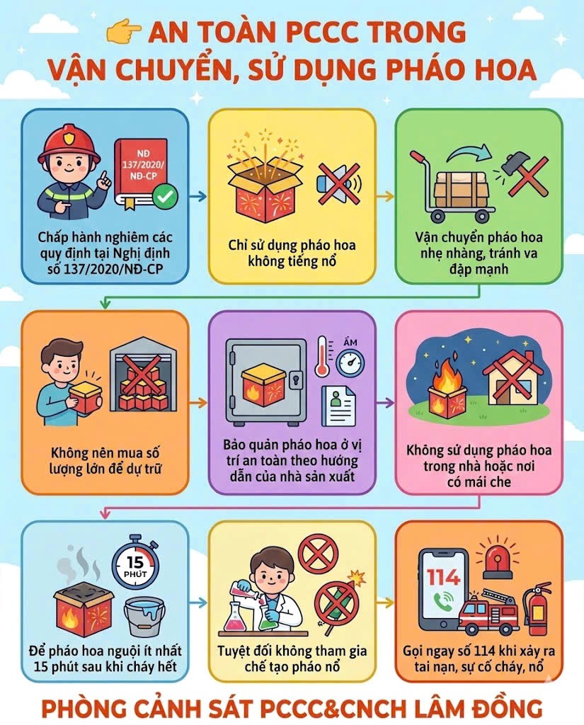 Từ thực tế đó, phòng Cảnh sát PCCC và CNCH – Công an tỉnh Lâm Đồng khuyến cáo các tổ chức, cá nhân cần lưu ý một số nội dung bảo đảm an toàn PCCC trong quá trình bảo quản, vận chuyển và sử dụng pháo hoa như sau: