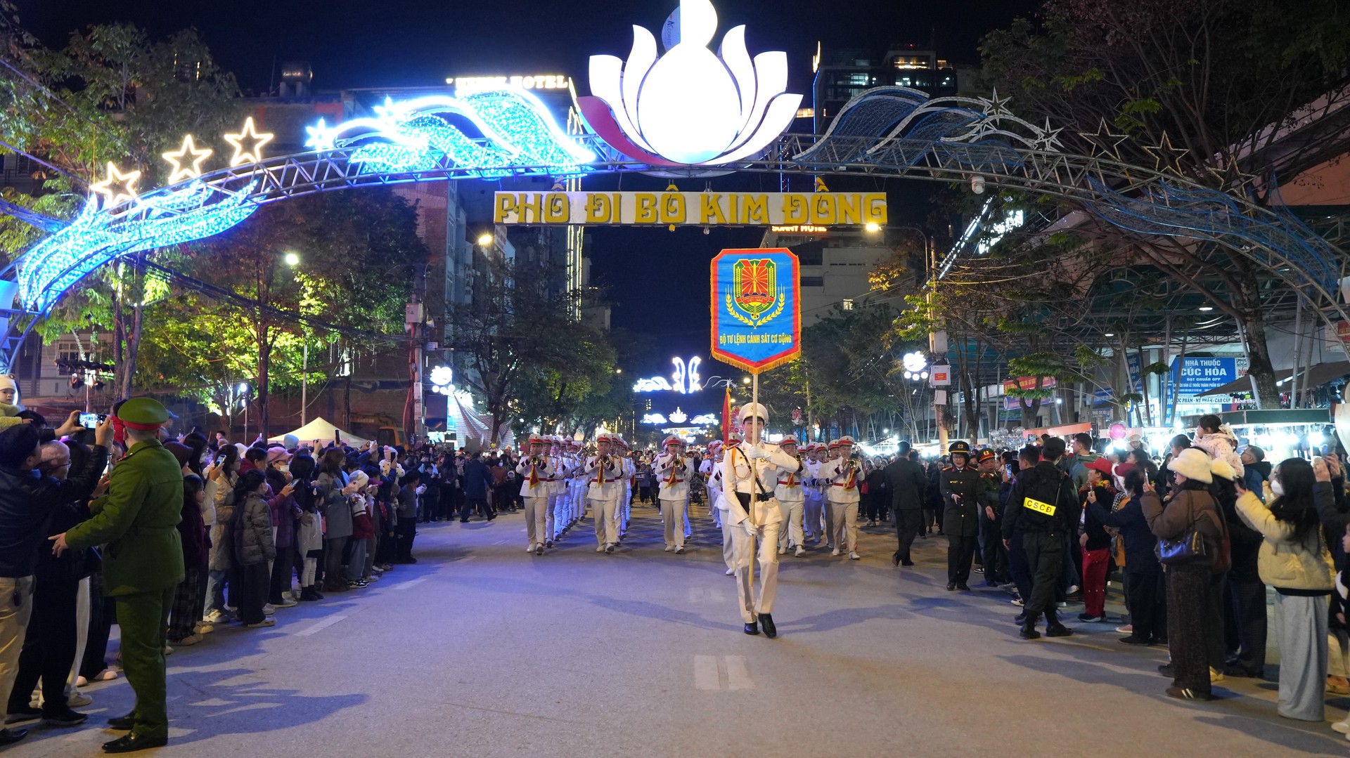 Biểu diễn nhạc kèn Công an nhân dân diễn ra trên tuyến Phố đi bộ Kim Đồng - Khu tượng đài Chủ tịch Hồ Chí Minh.