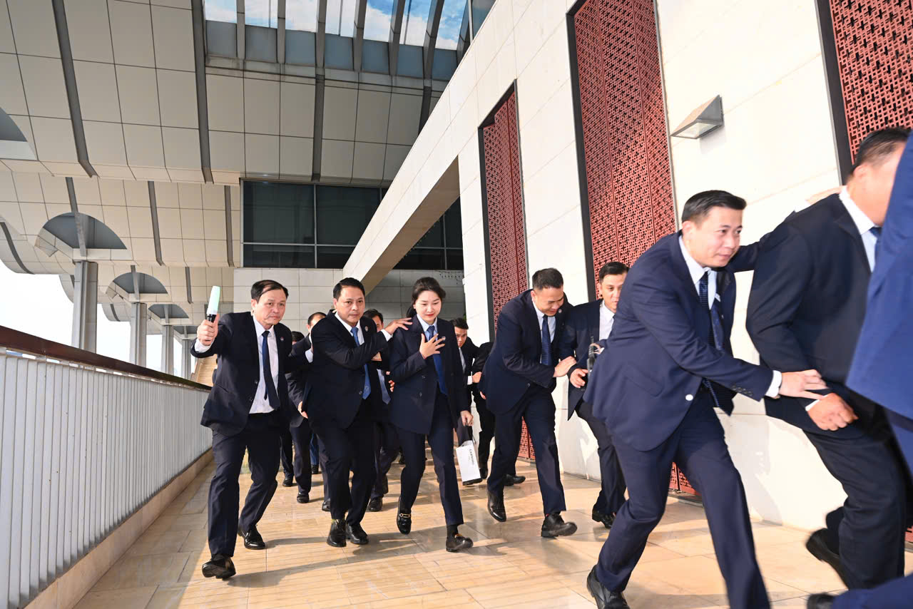 Cán bộ, chiến sĩ Cảnh vệ tổ chức diễn tập phương án di chuyển đại biểu ra khỏi Hội trường khi có tình huống khẩn cấp.