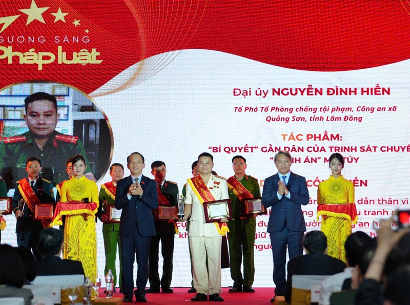 Trong số các cá nhân được vinh danh, Đại uý Nguyễn Đình Hiển – Phó Tổ trưởng Tổ Phòng chống Tội phạm, Trinh sát viên Trung cấp, Công an xã Quảng Sơn, tỉnh Lâm Đồng, vinh dự là một trong 55 “Gương sáng Pháp luật” toàn quốc năm 2025.