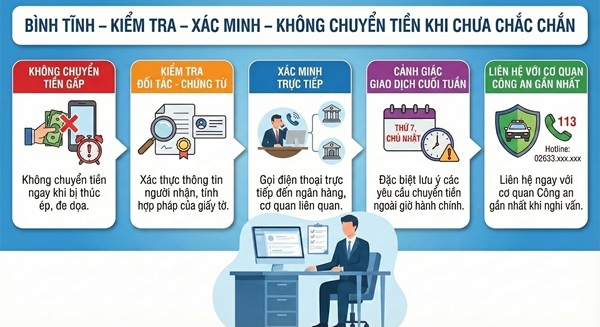 Để chủ động phòng ngừa, Công an xã Tà Đùng khuyến cáo các cơ quan, doanh nghiệp và Nhân dân nghiêm túc thực hiện nguyên tắc “3 không – 1 báo”: không chuyển tiền khi chưa xác minh trực tiếp danh tính đối tác; không tin vào hình ảnh chứng từ chuyển tiền qua mạng, chỉ giao dịch khi tiền đã thực sự hiển thị trong tài khoản; không thực hiện các giao dịch tài chính lớn, gấp gáp vào ngày nghỉ, ngoài giờ hành chính; kịp thời báo ngay cho cơ quan Công an khi phát hiện dấu hiệu bất thường hoặc bị thúc ép chuyển tiền vô lý.