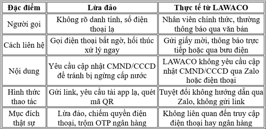 Các đối tượng lừa đảo sử dụng các số điện thoại bất kỳ (có thể hiện số lạ, số từ tổng đài giả hoặc số cá nhân) để gọi điện trực tiếp cho người dân, tự xưng là “nhân viên Công ty cấp thoát nước Lâm Đồng – LAWACO”. Chúng thông báo rằng: “Thông tin trong hợp đồng cấp nước của quý khách đã hết hạn do quý khách chuyển đổi giấy tờ tùy thân từ Chứng minh nhân dân (CMND) sang Căn cước công dân (CCCD). Quý khách cần cập nhật lại thông tin để không bị gián đoạn sử dụng nước.”