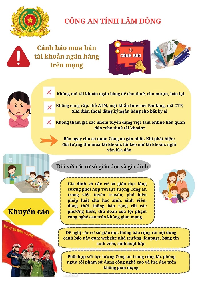 Cơ quan Công an khuyến cáo người dân tuyệt đối không mở, cho thuê hoặc bán tài khoản ngân hàng; không cung cấp thông tin cá nhân, thông tin tài khoản cho người lạ trên mạng. Đồng thời, cần nâng cao cảnh giác trước các lời mời gọi “việc nhẹ, thu nhập cao” để tránh trở thành nạn nhân hoặc tiếp tay cho tội phạm công nghệ cao.