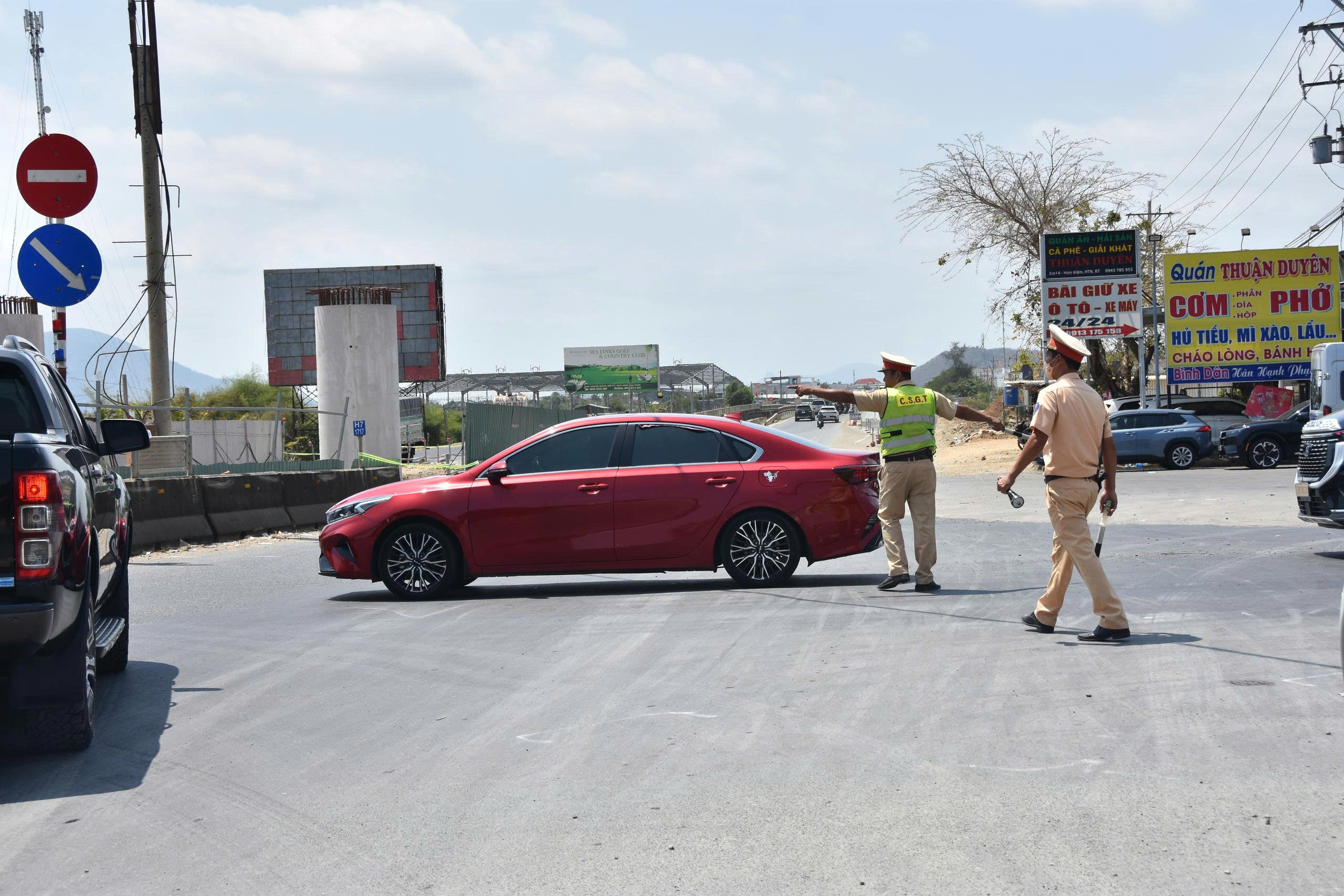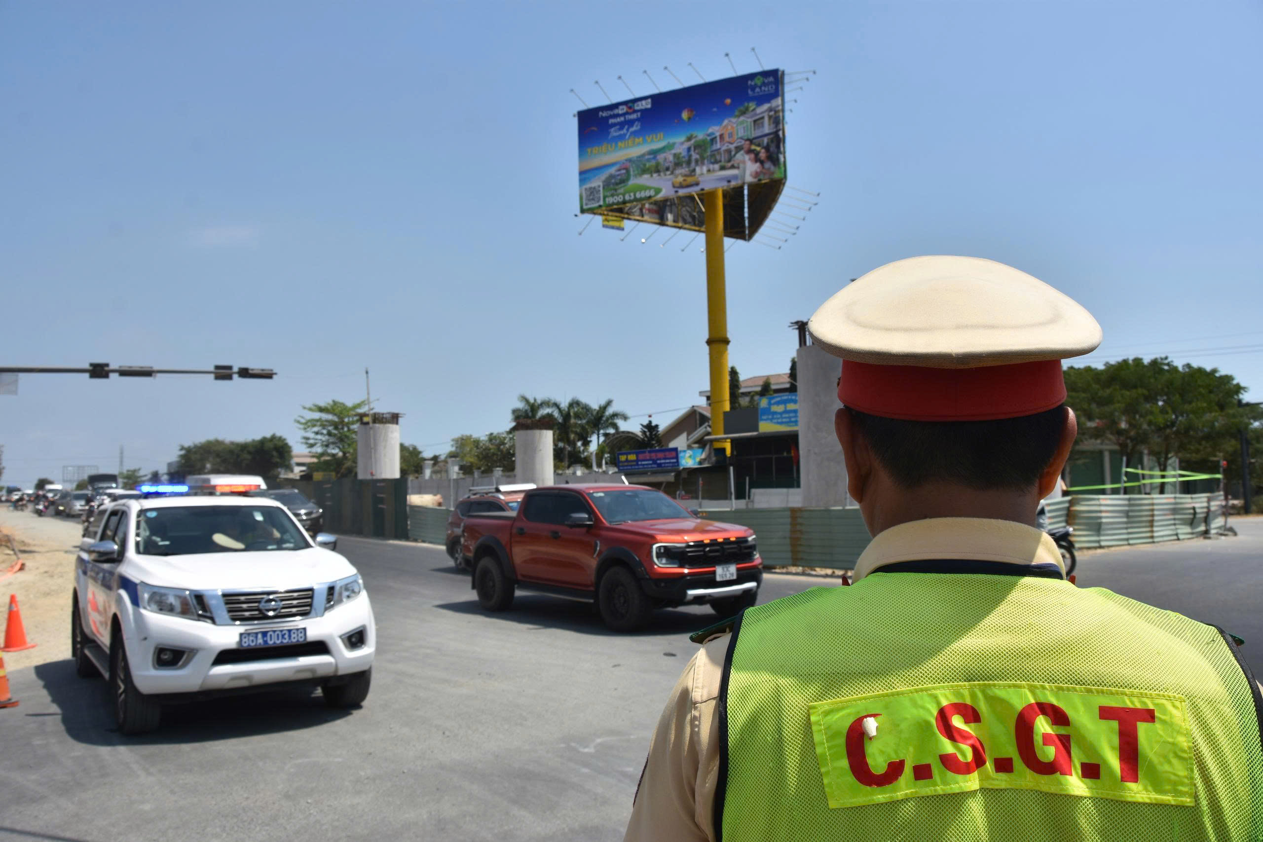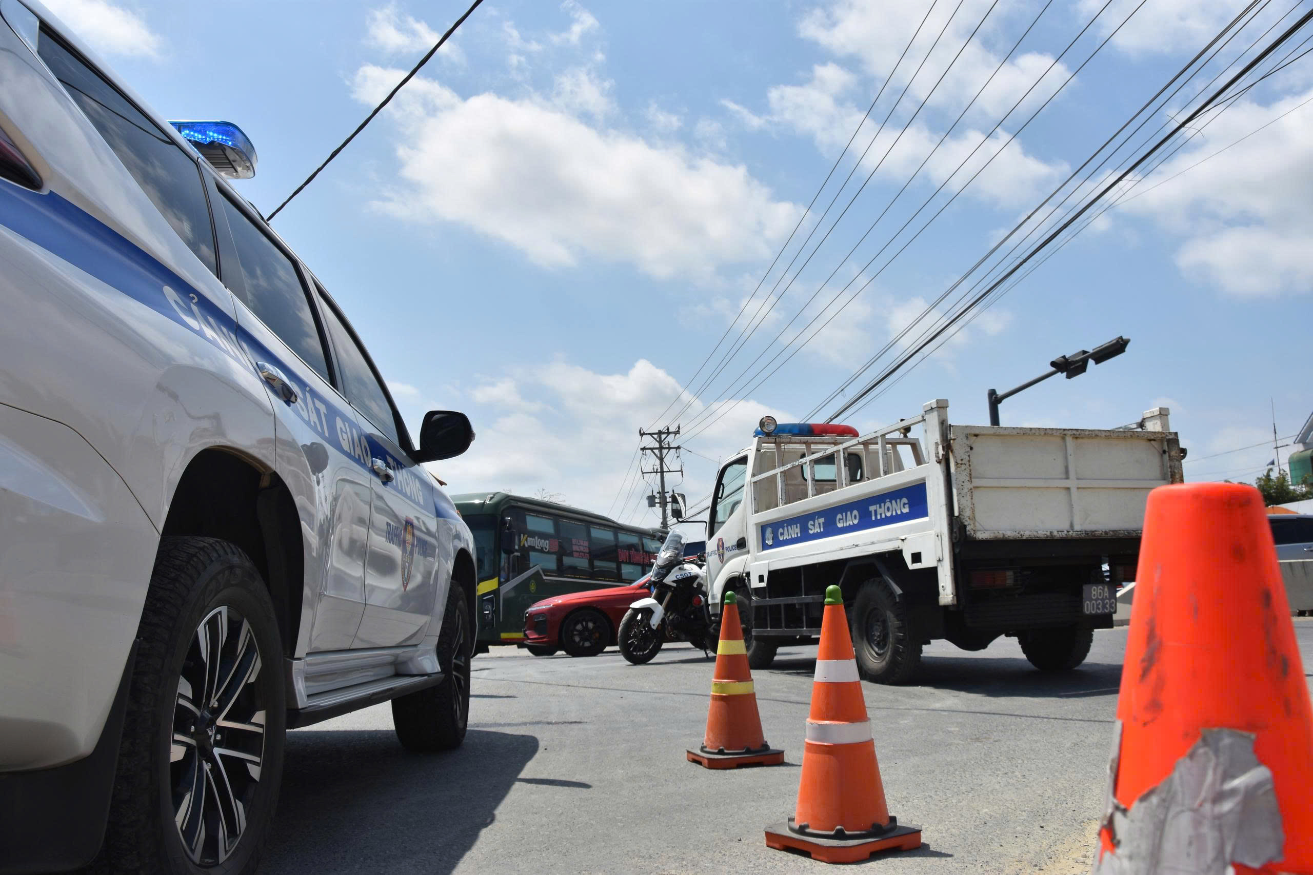 Lực lượng cảnh sát giao thông tiến hành điều tiết, phân luồng xe tại ngã ba Ba Bàu, xã Hàm Kiệm, tỉnh Lâm Đồng