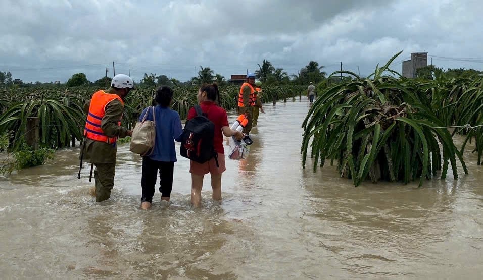 Lực lượng ANTT giúp người dân sơ tán trong mùa lũ tại thôn Hội Nhơn, xã Hàm Liêm.