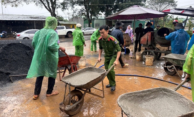 Đoàn viên Chi đoàn Công an phường góp sức xây dựng công trình