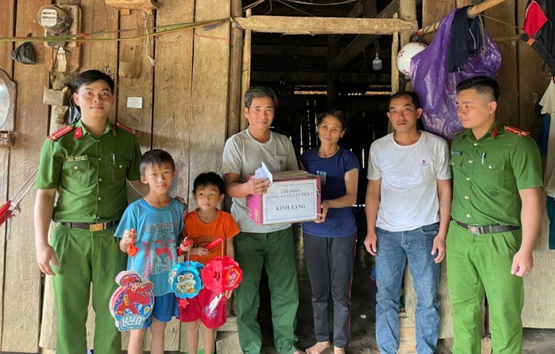 Chi đoàn Công an xã tặng quà cho hộ ông Bàn Văn Tiến tại Thôn Phước Thái, xã Cát Tiên 2