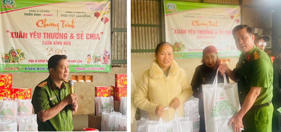 Tham dự chương trình có đồng chí Thượng tá Nguyễn Văn Thành – Phó Bí thư Chi bộ, Phó Trưởng Công an xã Đắk Sắk; đại diện lãnh đạo Công ty Cổ phần Thiên Sinh – KOMIK, Công ty TNHH MTV Thiệu Thúy Lâm Đồng; thôn trưởng thôn Đắk Hà, Ban hành giáo Giáo họ Đắk Hà cùng cán bộ, đoàn viên Chi đoàn Công an xã, nhân viên thị trường khu vực 3 – Đắk Nông và bà con có hoàn cảnh khó khăn trên địa bàn thôn Đắk Hà, xã Đắk Sắk, tỉnh Lâm Đồng.