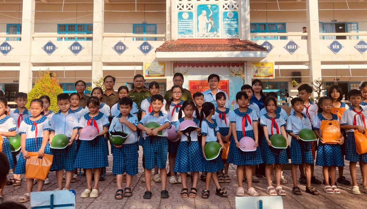 Công an xã đã tặng 25 nón bảo hiểm và 20 phần quà cho học sinh khó khăn tại Trường Tiểu học Mai Thúc Loan