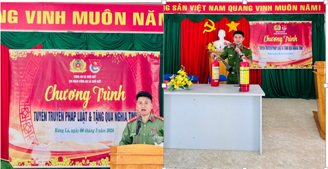 Hưởng ứng Tháng Thanh niên năm 2026 và các hoạt động chào mừng kỷ niệm 95 năm Ngày thành lập Đoàn TNCS Hồ Chí Minh (26/3/1931 – 26/3/2026), đồng thời thực hiện cao điểm tấn công, trấn áp tội phạm, bảo đảm an ninh trật tự phục vụ bầu cử đại biểu Quốc hội khóa XVI và đại biểu Hội đồng nhân dân các cấp nhiệm kỳ 2026 – 2031, ngày 08/3/2026, Chi đoàn Công an xã Suối Kiết đã tổ chức chương trình tuyên truyền pháp luật kết hợp hoạt động thiện nguyện cho bà con nhân dân tại thôn Rừng Lá, xã Suối Kiết.