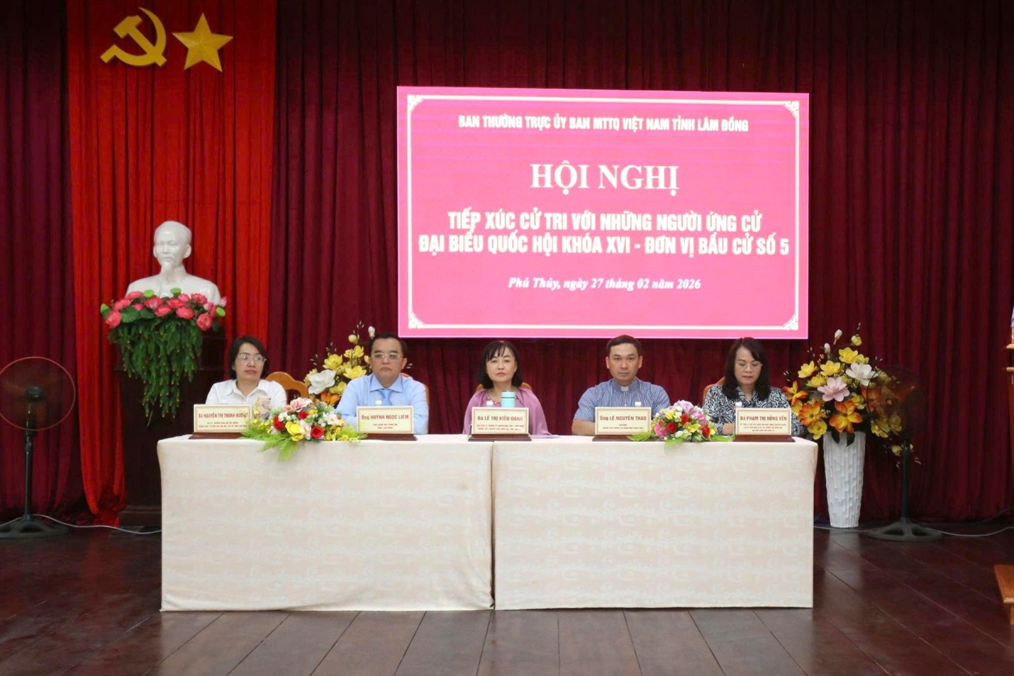 Các ứng cử viên tham gia ứng cử đại biểu Quốc hội khóa XVI, nhiệm kỳ 2026-2031 tại đơn vị bầu cử số 5 tỉnh Lâm Đồng gồm: Đại tá, Tiến sỹ Huỳnh Ngọc Liêm, Phó Giám đốc Công an tỉnh Lâm Đồng; Bà Nguyễn Thị Thanh Hương, Trưởng Khoa Nội - Nhi - Nhiễm, Trung tâm Y tế khu vực Đắk Mil, Sở Y tế Lâm Đồng; bà Lê Thị Kiều Oanh, Giáo viên Trường THPT Chuyên Trần Hưng Đạo, tỉnh Lâm Đồng; ông Lê Nguyên Thao, Linh mục, Chánh Văn phòng Tòa Giám mục Phan Thiết và bà Phạm Thị Hồng Yến, Ủy viên là đại biểu Quốc hội hoạt động chuyên trách tại Ủy ban Kinh tế và Tài chính của Quốc hội, Đại biểu Quốc hội khóa XV. Tại hội nghị, cử tri được nghe tóm tắt tiểu sử, chương trình hành động của từng ứng cử viên, qua đó thể hiện quyết tâm nếu được tín nhiệm sẽ phát huy vai trò đại diện, lắng nghe và phản ánh trung thực tâm tư, nguyện vọng của Nhân dân tới Quốc hội.