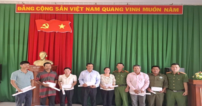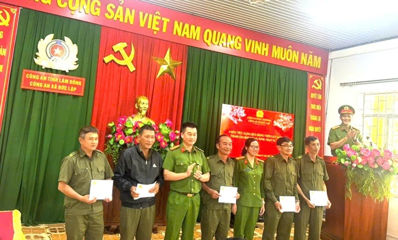 Chỉ huy Công an xã Đức Lập tặng quà cho lực lượng tham gia bảo vệ an ninh trật tự cơ sở