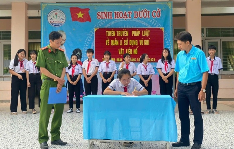 Ngày 11/01/2026, Công an xã Tân Thành phối hợp Trường THCS Tân Thuận tổ chức tuyên truyền pháp luật về vũ khí, vật liệu nổ, công cụ hỗ trợ và pháo cho cán bộ, giáo viên và học sinh. Qua tuyên truyền, học sinh được nâng cao nhận thức về sự nguy hiểm của các hành vi vi phạm, đồng thời được phổ biến các quy định pháp luật mới liên quan đến xử phạt vi phạm hành chính trong lĩnh vực an ninh, trật tự, góp phần giữ gìn môi trường học đường an toàn.