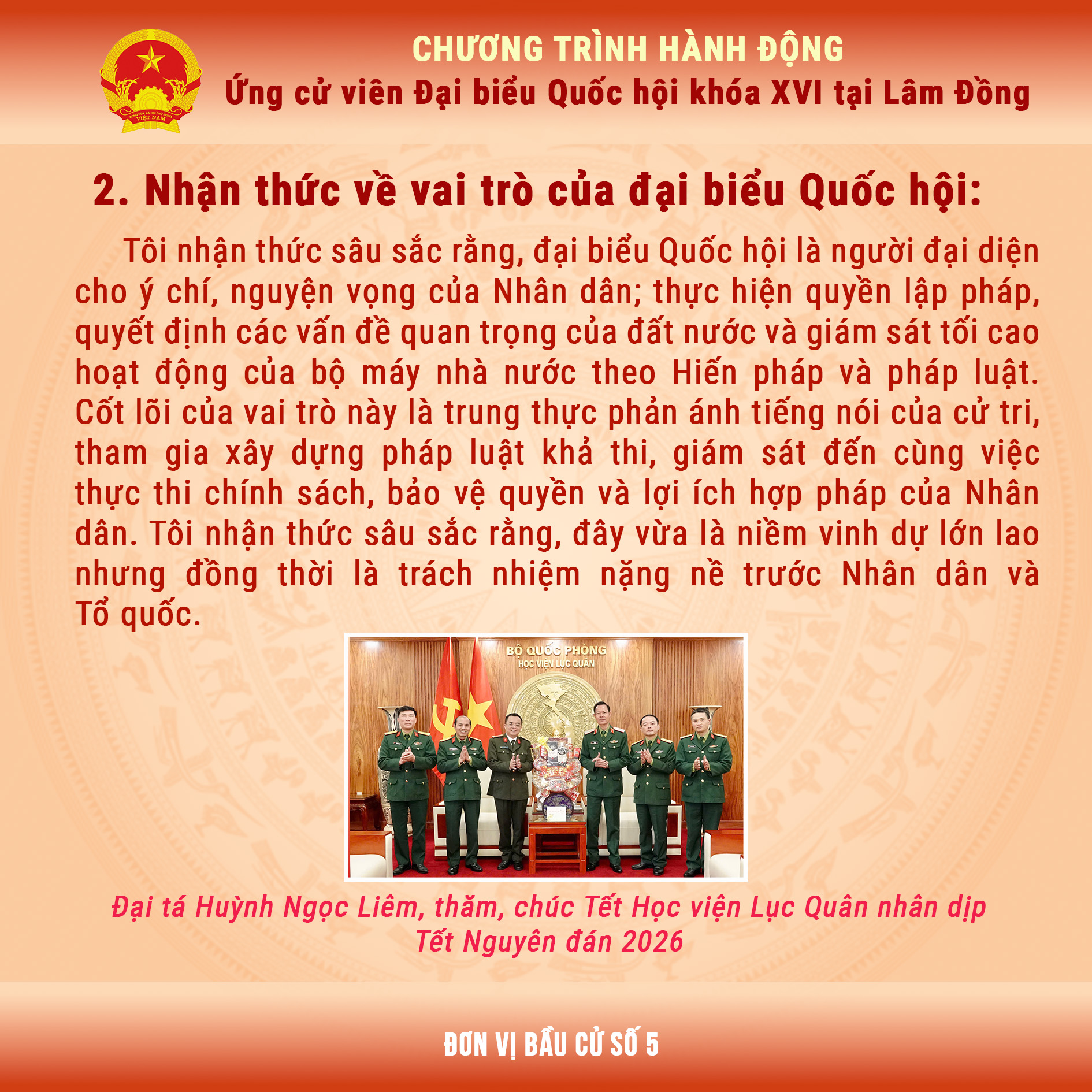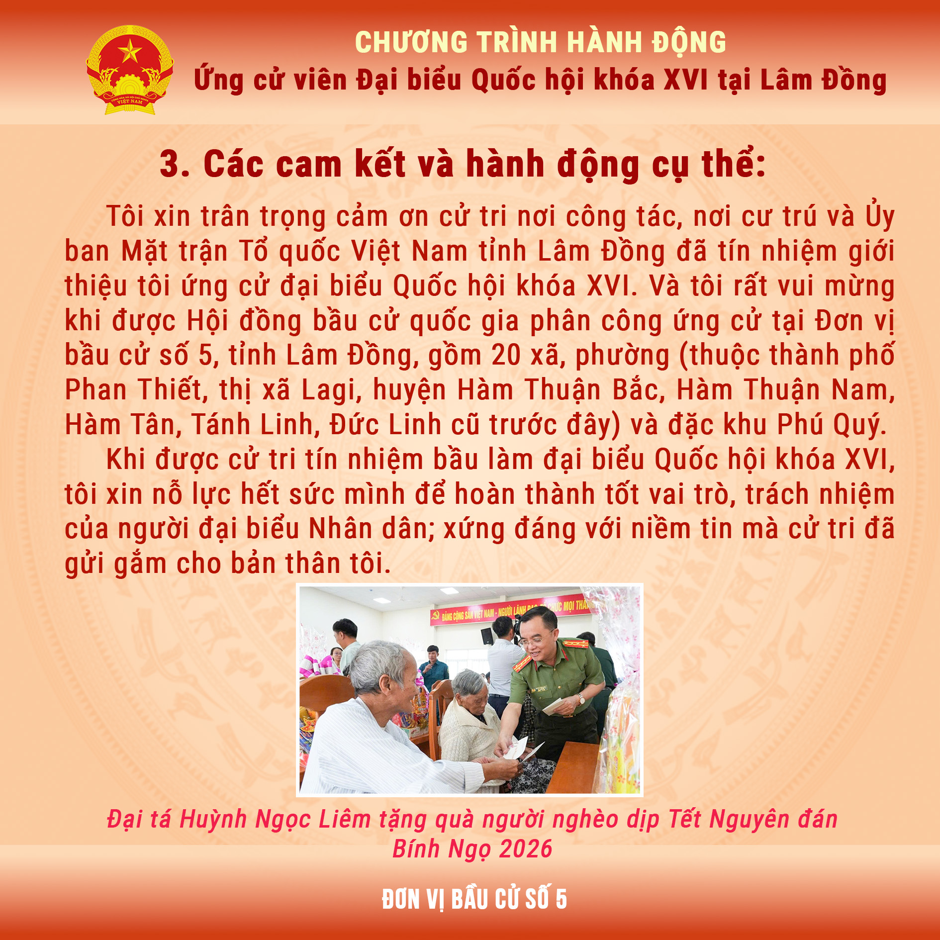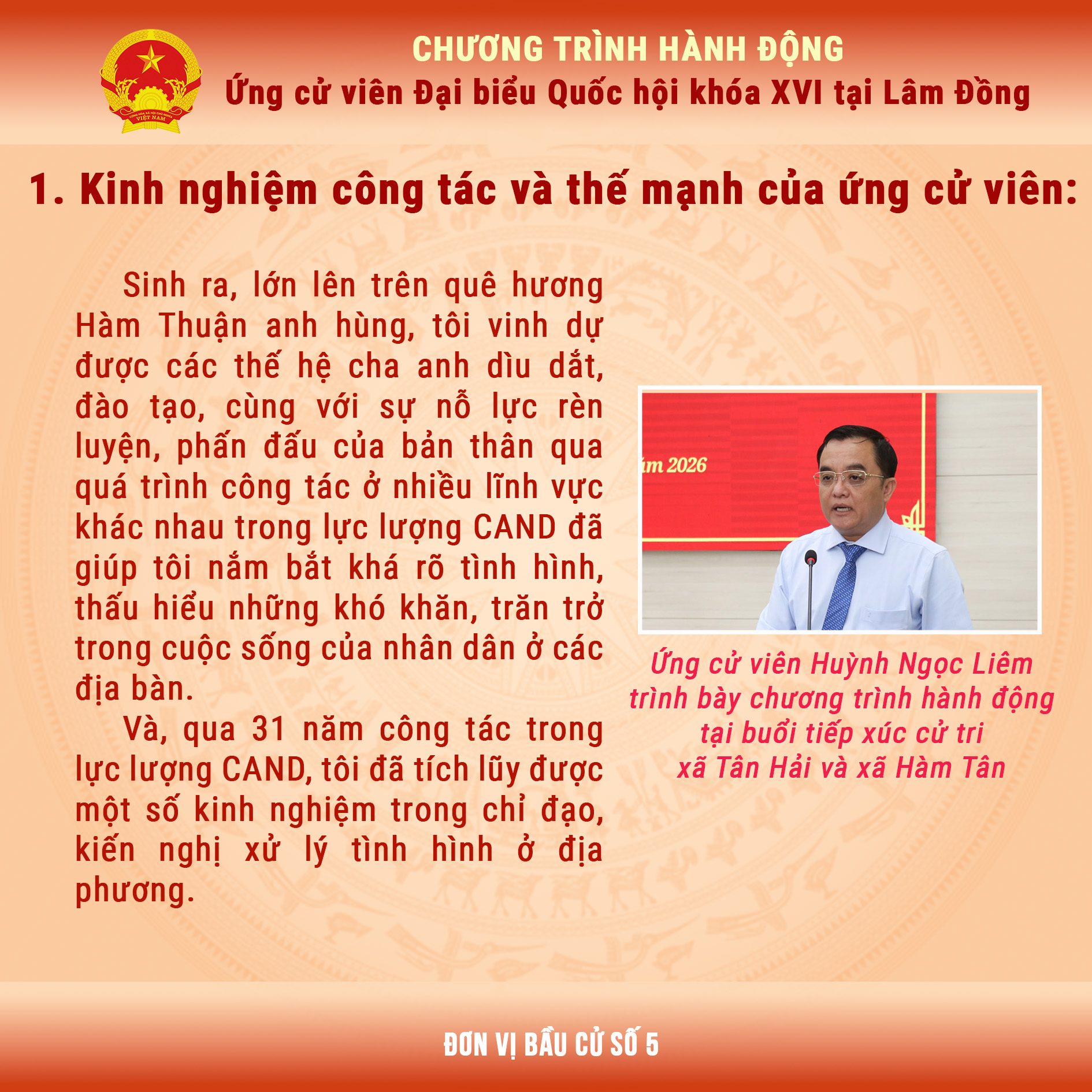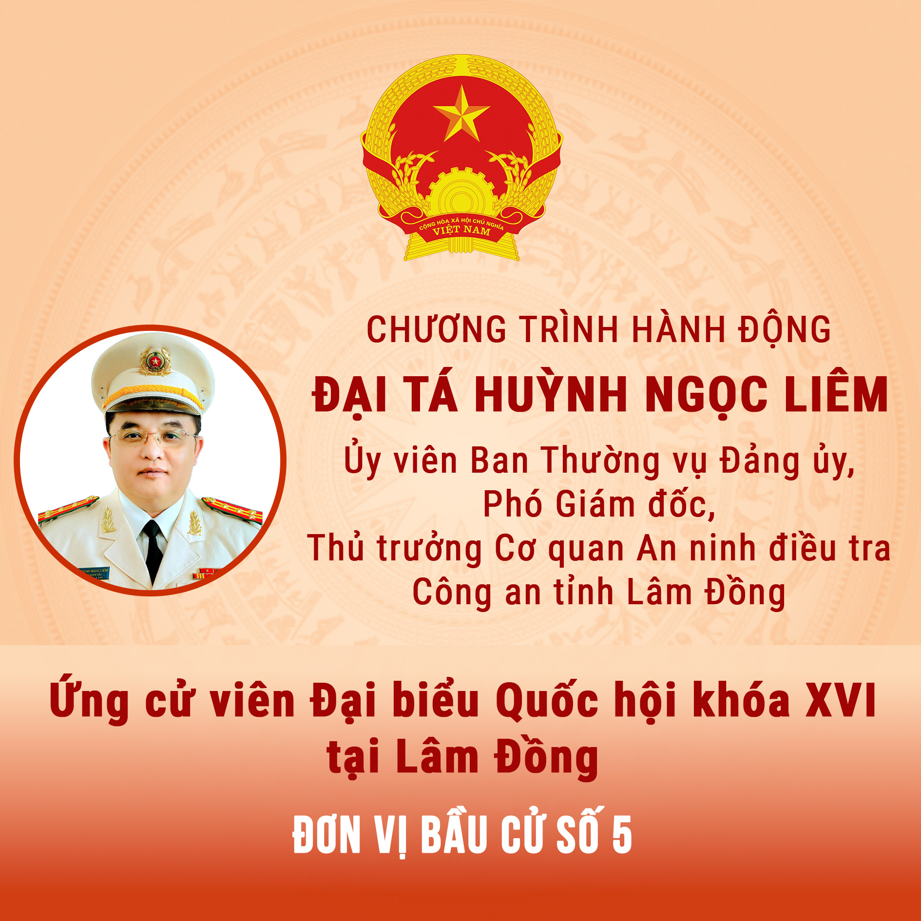 Tại các hội nghị tiếp xúc cử tri, vận động bầu cử đối với người ứng cử đại biểu Quốc hội khóa XVI, đơn vị bầu cử số 5 tại Lâm Đồng, Đại tá Huỳnh Ngọc Liêm, Ủy viên Ban Thường vụ Đảng ủy, Phó Giám đốc, Thủ trưởng Cơ quan an ninh điều tra Công an tỉnh Lâm Đồng đã trình bày chương trình hành động trước cử tri. Công an tỉnh Lâm Đồng trân trọng giới thiệu nội dung các chương trình hành động của Đại tá Huỳnh Ngọc Liêm, Phó Giám đốc Công an tỉnh Lâm Đồng: Thực hiện: Nhật Minh