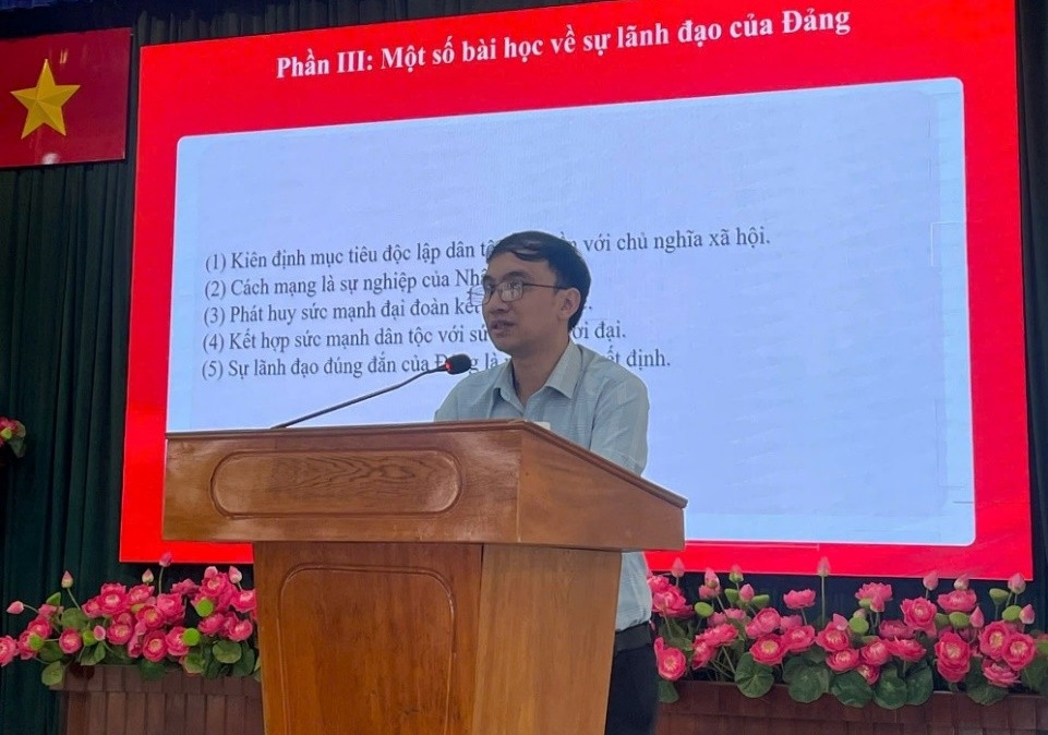 Báo cáo viên Trung tâm chính trị xã Kiến Đức truyền đạt nội dung cho học viên