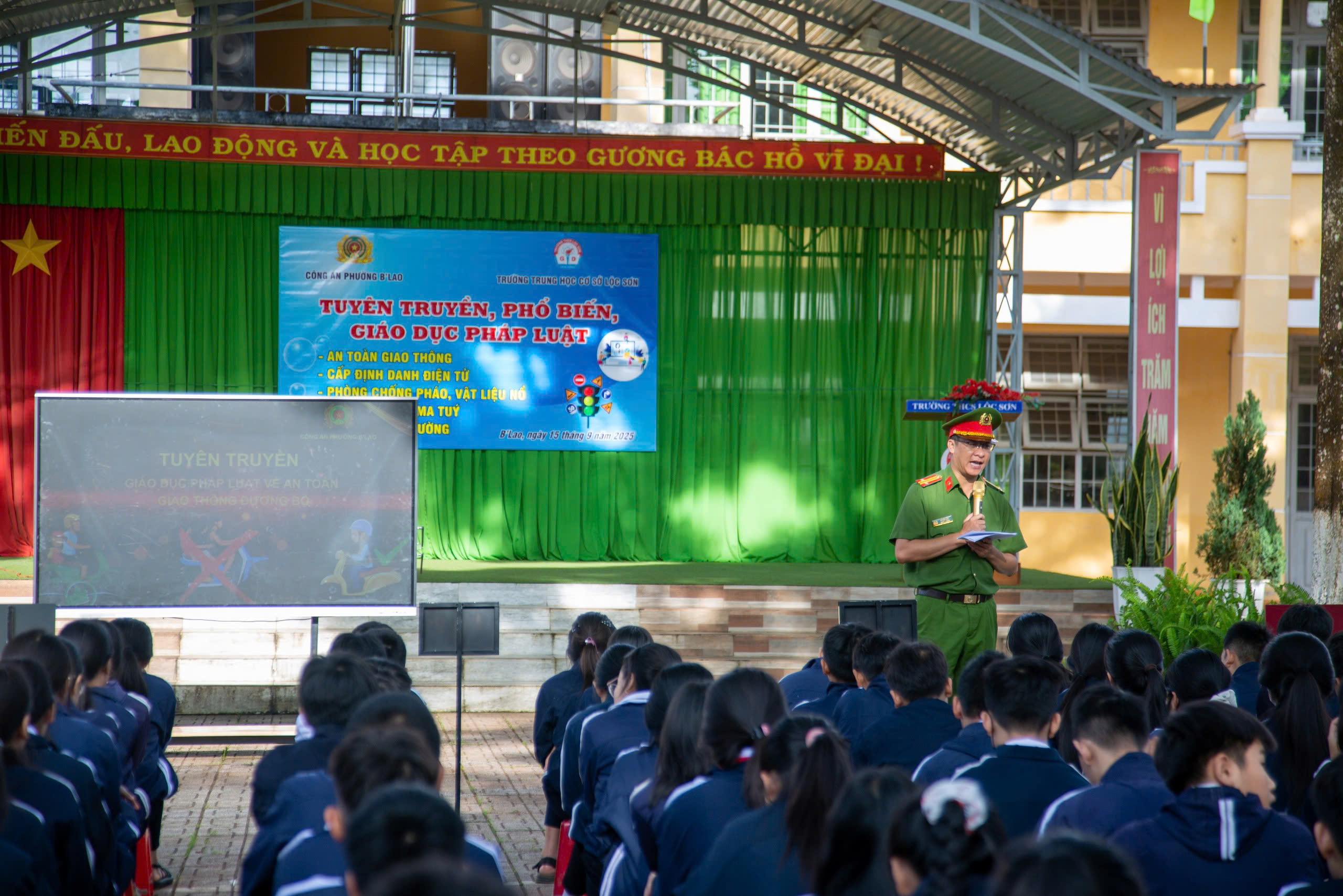 Tại phường B’Lao, Công an phường phối hợp Trường THCS Lộc Sơn tổ chức tuyên truyền an toàn giao thông, phòng chống pháo nổ, ma túy, bạo lực học đường và hướng dẫn thủ tục cấp căn cước công dân cho học sinh từ đủ 14 tuổi. Buổi ngoại khóa thu hút sự tham gia tích cực của đông đảo học sinh, giáo viên, diễn ra trong không khí sinh động, gần gũi, hiệu quả.