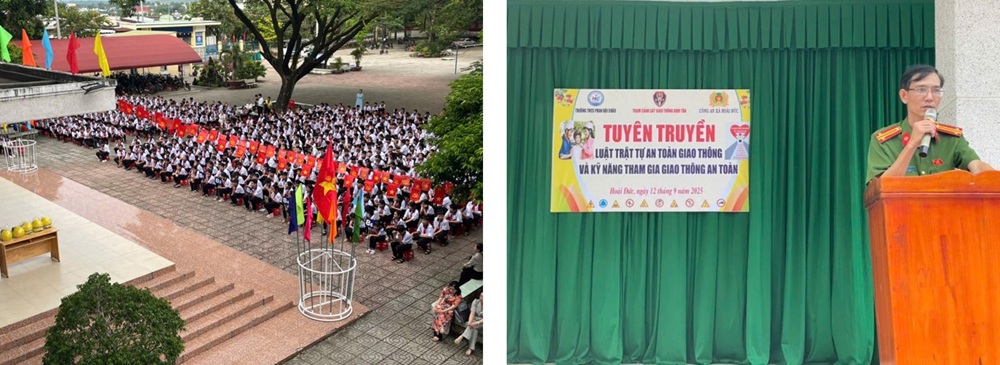 Tại xã Hoài Đức, Công an xã đã phối hợp Tổ CSGT số 5 - Trạm CSGT Hàm Tân và Ban Giám hiệu Trường THCS Phan Bội Châu tổ chức tuyên truyền Luật Giao thông đường bộ, phòng chống bạo lực học đường và tác hại của ma túy cho gần 2.000 cán bộ, giáo viên và học sinh. Buổi tuyên truyền có sự tham gia của 94 giáo viên và 1.805 học sinh. Cán bộ Công an xã đã thông tin tình hình TTATGT trên địa bàn, phân tích nguyên nhân phổ biến dẫn đến tai nạn giao thông, đồng thời khuyến cáo học sinh không thử ma túy dù chỉ một lần, nói không với bạo lực và tránh xa phim ảnh, video bạo lực trên mạng xã hội. Ngoài phần tuyên truyền, học sinh còn được tham gia trả lời câu hỏi, thi tìm hiểu pháp luật và nhận nhiều phần quà ý nghĩa.