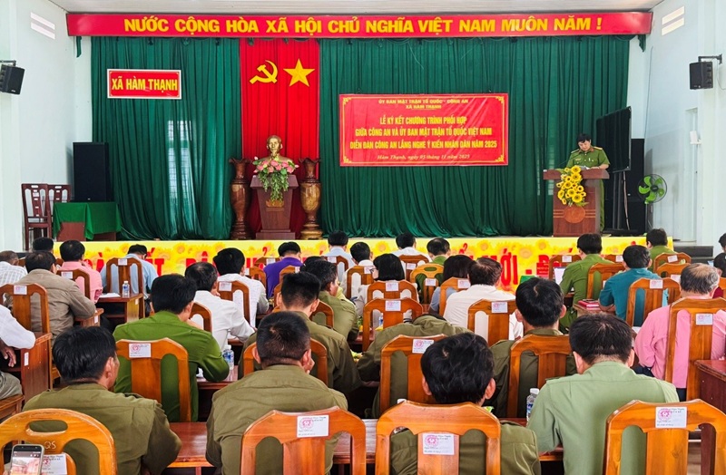 Cũng trong ngày 05/11/2025, tại xã Hàm Thạnh, diễn đàn “Công an lắng nghe ý kiến Nhân dân” được tổ chức với sự tham gia của lãnh đạo cấp ủy, chính quyền, các ban ngành, đoàn thể và đông đảo Nhân dân. Tại đây, cán bộ, chiến sĩ Công an xã đã báo cáo kết quả công tác bảo đảm an ninh trật tự, phòng chống tội phạm, cải cách hành chính và xây dựng phong trào Toàn dân bảo vệ an ninh Tổ quốc. Nhiều ý kiến đóng góp được ghi nhận, tập trung vào việc nâng cao chất lượng phục vụ Nhân dân. Kết thúc diễn đàn, Công an xã và Ủy ban MTTQ Việt Nam xã đã ký kết chương trình phối hợp đẩy mạnh phong trào Toàn dân bảo vệ ANTQ giai đoạn 2023–2033.
