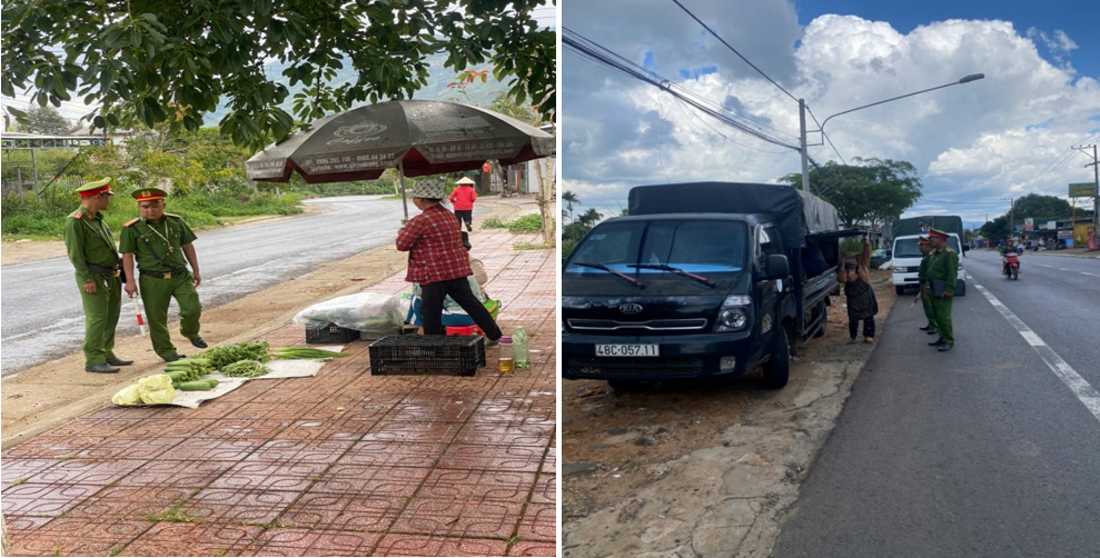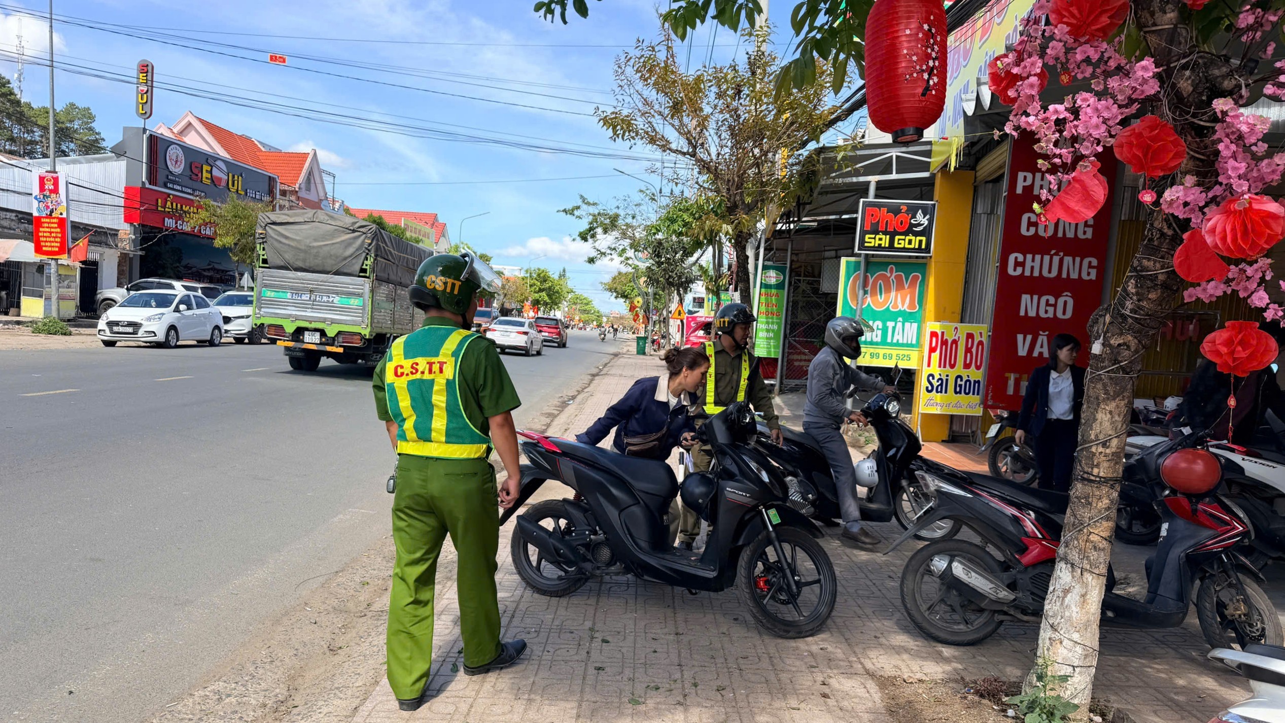 Công an phường B'Lao tuyên truyền, nhắc nhỡ các cửa hàng, các trường hợp buôn bán lấn chiếm lòng, lề đường thực hiện nghiêm các quy định về TTATGT