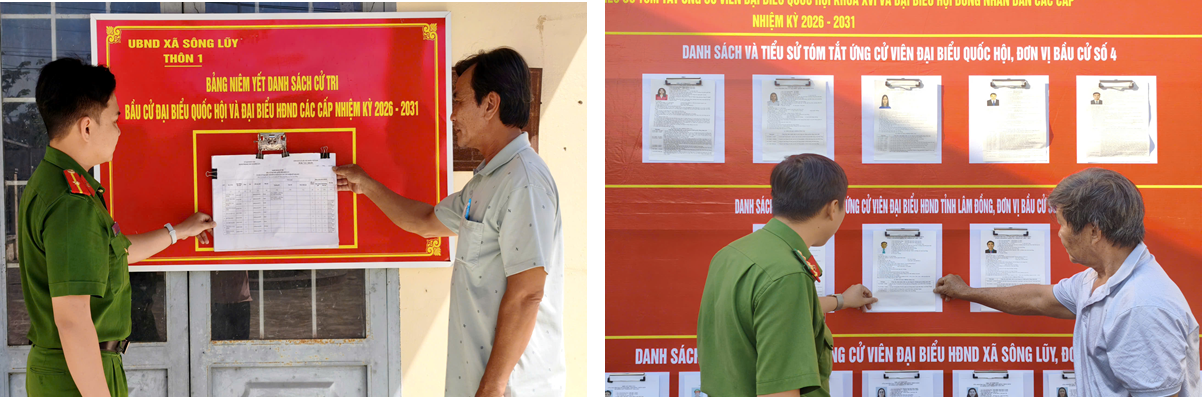 Công an xã Sông Lũy phối hợp UBND xã và Ban điều hành thôn niêm yết danh sách cử tri tại các điểm bầu cử