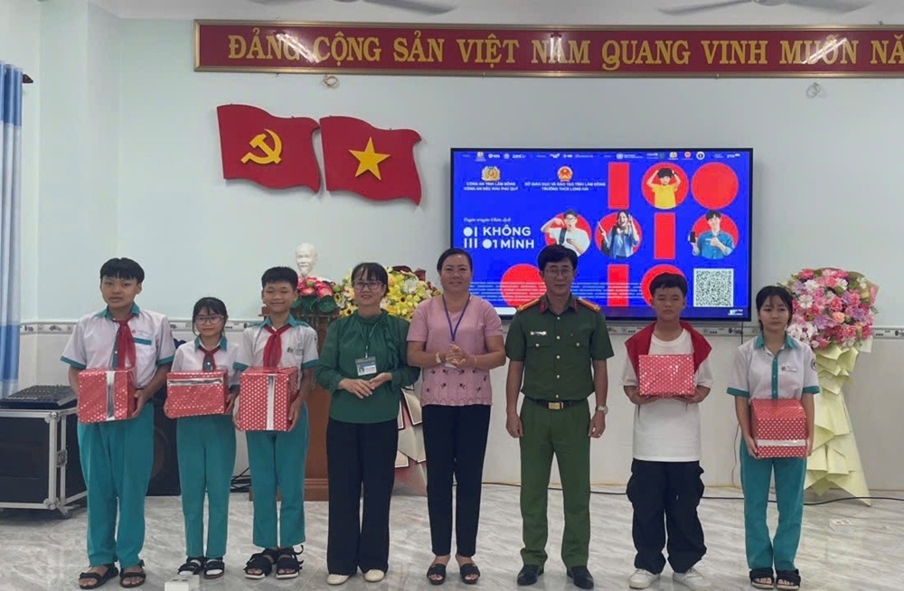 Lãnh đạo Nhà trường và Chỉ huy Công an đặc khu tặng quà động viên học sinh có thành tích trong khuôn khổ truyền truyền chiến dịch “Không một mình” - “Cùng nhau an toàn trực tuyến”