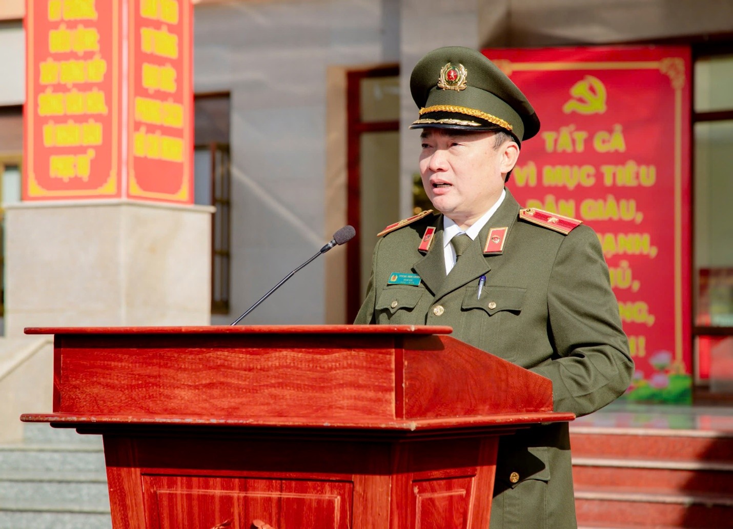 Thiếu tướng Trương Minh Đương, Ủy viên Ban Thường vụ Tỉnh ủy, Bí thư Đảng ủy, Giám đốc Công an tỉnh quán triệt Sáu điều Bác hồ dạy Công an nhân dân trước CBCS Công an tỉnh tại lễ chào cờ đầu tháng