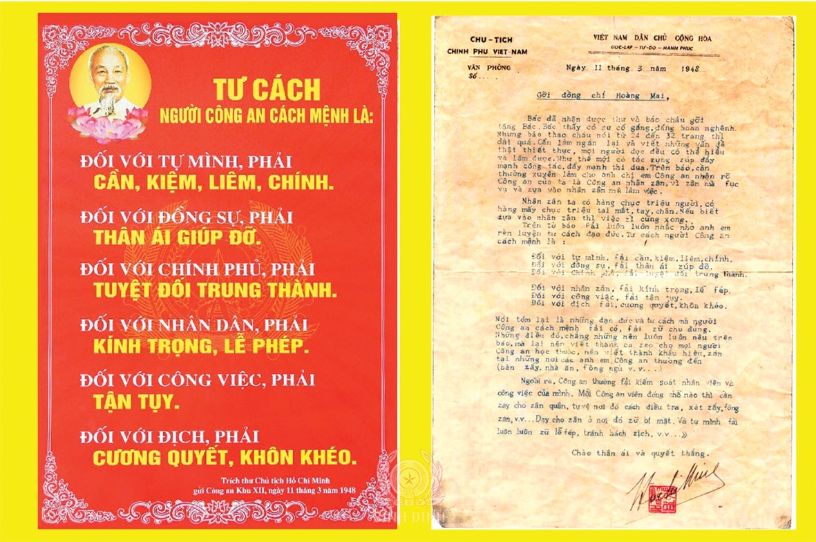 Ngày 11/3/1948, trong thư gửi đồng chí Hoàng Mai – Giám đốc Công an Khu XII, Chủ tịch Hồ Chí Minh đã căn dặn lực lượng Công an sáu nội dung về “Tư cách người Công an cách mệnh”, gồm: Đối với tự mình phải cần, kiệm, liêm, chính; đối với đồng sự phải thân ái giúp đỡ; đối với Chính phủ phải tuyệt đối trung thành; đối với Nhân dân phải kính trọng, lễ phép; đối với công việc phải tận tụy; đối với địch phải cương quyết, khôn khéo. Sáu điều dạy ngắn gọn nhưng hàm chứa những giá trị sâu sắc, trở thành kim chỉ nam trong rèn luyện, công tác và chiến đấu của các thế hệ cán bộ, chiến sĩ Công an nhân dân suốt gần tám thập kỷ qua.