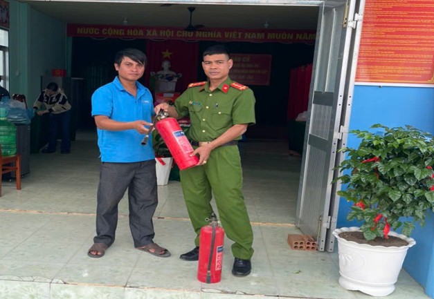 Công an xã La Dạ hướng dẫn sử dụng bình chữa cháy và tuyên truyền các biện pháp phòng ngừa cháy, nổ tại điểm bầu cử