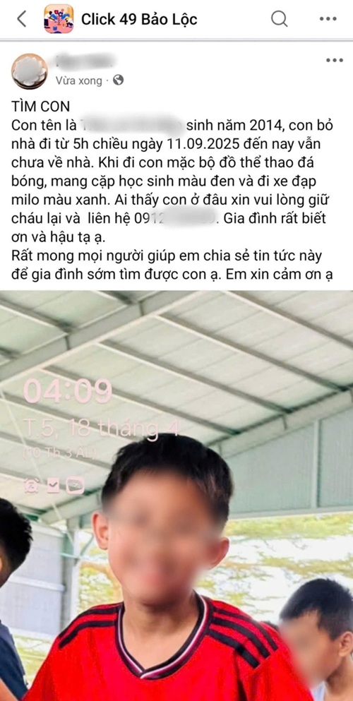 Theo thông tin ban đầu, chiều ngày 11/9/2025, cháu C.B rời khỏi nhà sau khi xảy ra mâu thuẫn nhỏ với bạn học và phụ huynh được mời đến làm việc với giáo viên chủ nhiệm. Gia đình mất liên lạc hoàn toàn với cháu và đã trình báo vụ việc cho Công an Phường 2 Bảo Lộc vào sáng hôm sau.