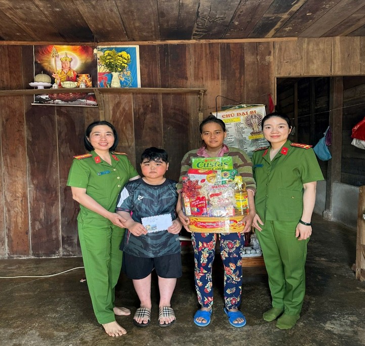 Công an phường Bắc Gia Nghĩa tặng quà cho em Trần Đình Quân, học sinh Trường THCS Trần Phú.