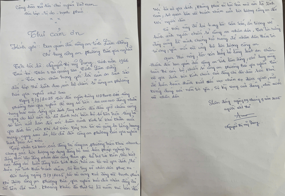 Cảm kích trước sự hỗ trợ kịp thời và trách nhiệm của lực lượng Công an, chị Dung và anh Đăng đã viết thư cảm ơn đến Công an phường Bắc Gia Nghĩa, đồng thời bày tỏ sự trân trọng đối với tinh thần trách nhiệm, hành động trung thực, nghĩa tình của chị Từ Thị Mỹ Thanh và em Nguyễn Trung Bảo Nguyên.