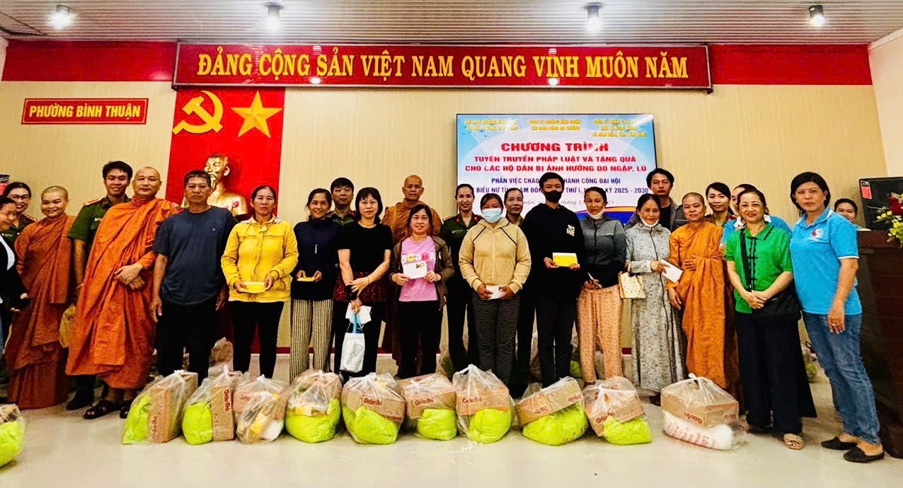 Sau buổi tuyên truyền, Công an phường Bình Thuận phối hợp với các mạnh thường quân trao tặng 200 phần quà cho bà con Nhân dân bị ảnh hưởng do ngập, lũ, trị giá 600.000 đồng/phần, gồm: 10 kg gạo; 01 thùng mì; 01 chai dầu ăn; 01 chai xì dầu và 300.000 đồng tiền mặt.