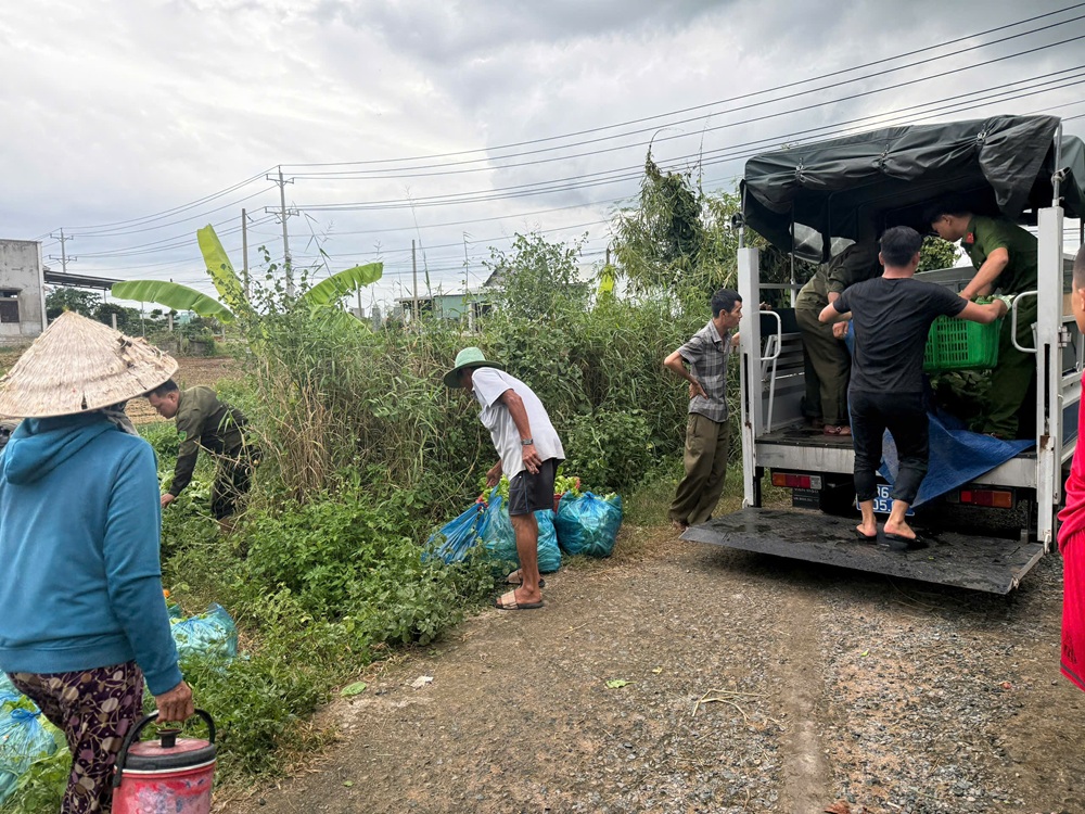 Công an phường Hàm Thắng phối hợp cùng lực lượng đoàn thể tại địa phương hỗ trợ bà con nhân dân thu gom rau màu.