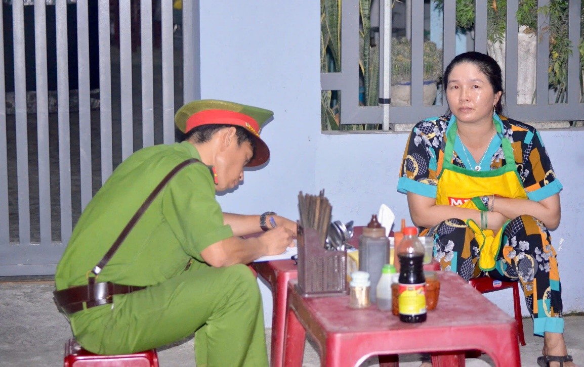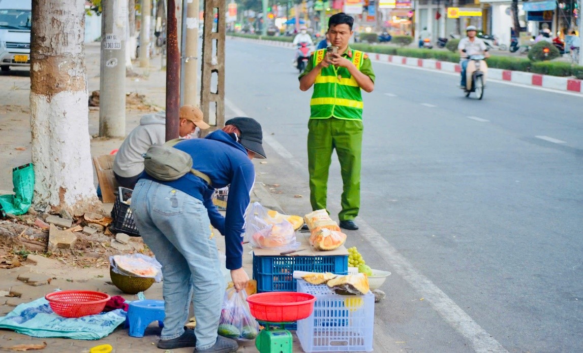 Thiếu tá Nguyễn Đức Trung – Cán bộ Công an phường La Gi ghi hình lại trường hợp buôn bán lấn chiếm lòng, lề đường