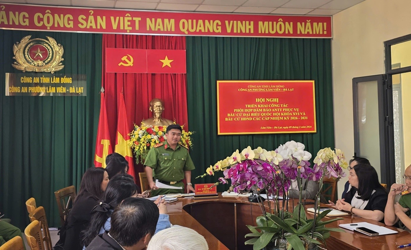 Chiều ngày 09/3/2026, Công an phường Lâm Viên – Đà Lạt tổ chức Hội nghị triển khai công tác phối hợp bảo đảm an ninh trật tự phục vụ cuộc bầu cử đại biểu Quốc hội khóa XVI và bầu cử đại biểu Hội đồng nhân dân các cấp nhiệm kỳ 2026 – 2031 trên địa bàn phường.