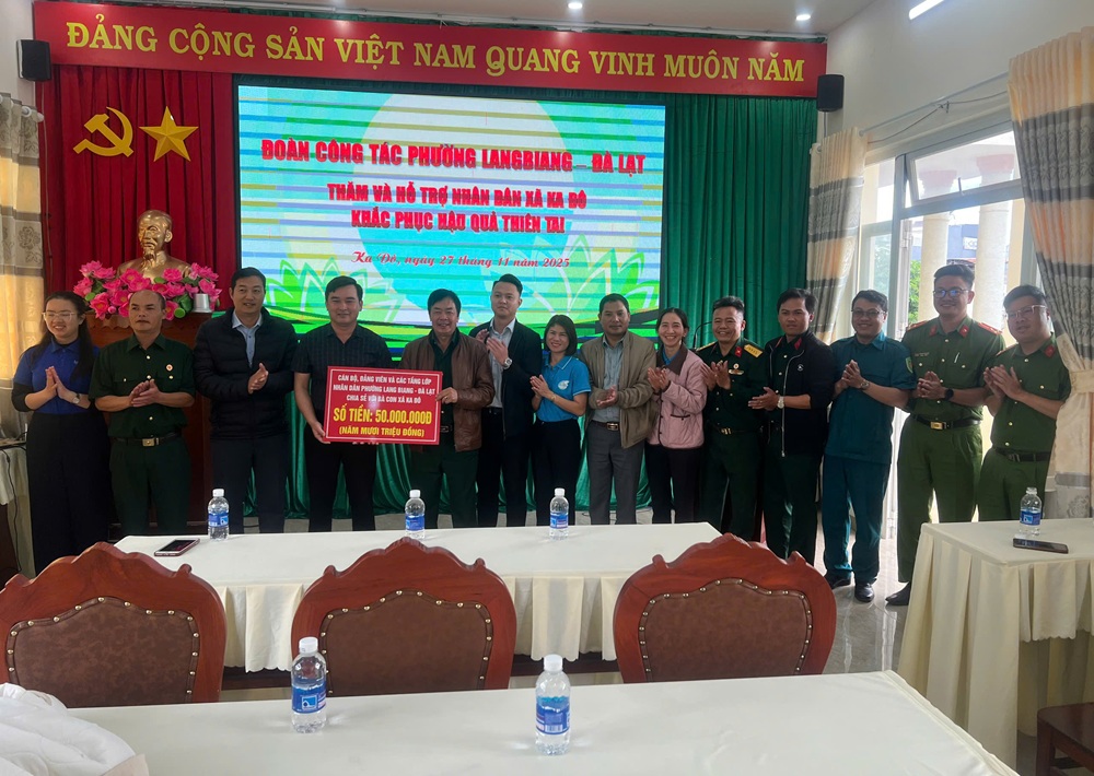 Tiếp nối hoạt động ý nghĩa này, ngày 27/11/2025, Công an phường phối hợp các ban, ngành, đoàn thể và UBND phường Lang Biang thành lập đoàn công tác trực tiếp đến hỗ trợ các xã bị ảnh hưởng nặng. UBND phường đã quyên góp tổng cộng 300.000.000 đồng cùng nhiều nhu yếu phẩm như 300 thùng mì, 01 tấn gạo, sữa, nước mắm… gửi tới các xã Đơn Dương, Hiệp Thạnh, Ka Đô, Ninh Gia, D’ran.