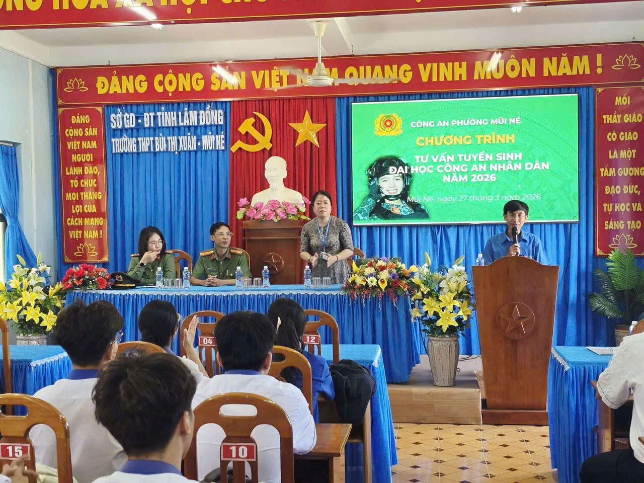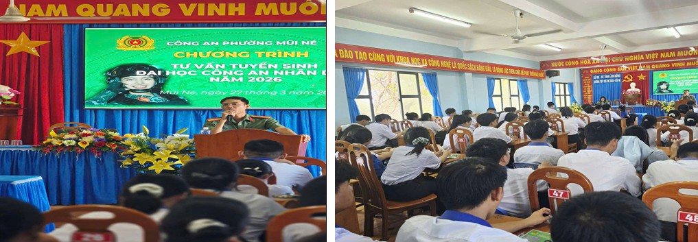 Công an phường Mũi Né đã phổ biến các quy định của Bộ Công an về tuyển sinh vào các trường Công an nhân dân năm 2026, nhấn mạnh tiêu chuẩn về chính trị, độ tuổi, học lực, rèn luyện và sức khỏe đối với thí sinh dự tuyển. Đồng thời, phân tích các phương thức xét tuyển, bài thi đánh giá của Bộ Công an, cách tính điểm và định hướng lựa chọn tổ hợp môn phù hợp với năng lực của thí sinh.