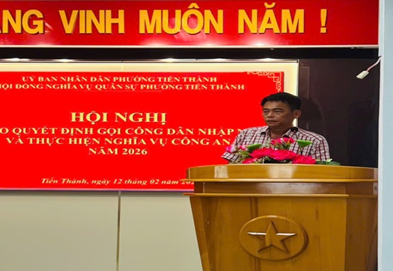 Đến dự và chỉ đạo, đồng chí Trần Hữu Minh Tùng – Chủ tịch Ủy ban nhân dân phường Tiến Thành đã phát biểu động viên các tân binh phát huy truyền thống cách mạng của quê hương. Đồng chí yêu cầu các công dân trúng tuyển nghĩa vụ quân sự và nghĩa vụ Công an nhân dân năm 2026 sau khi nhập ngũ phải không ngừng giữ gìn phẩm chất đạo đức, chấp hành nghiêm kỷ luật và tích cực rèn luyện để hoàn thành xuất sắc mọi nhiệm vụ.