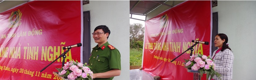Đ/c Đại tá Nguyễn Văn Dũng – Phó Giám đốc Công an tỉnh; Đ/c Thị Trãi – Phó Bí thư Thường trực Đảng ủy xã Trường Xuân phát biểu tại buổi lễ