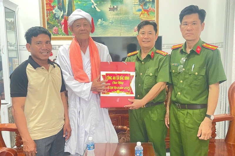 Đồng chí Trưởng Công an xã Bắc Bình thăm, tặng quà cho chức sắc Chăm Bàlamôn