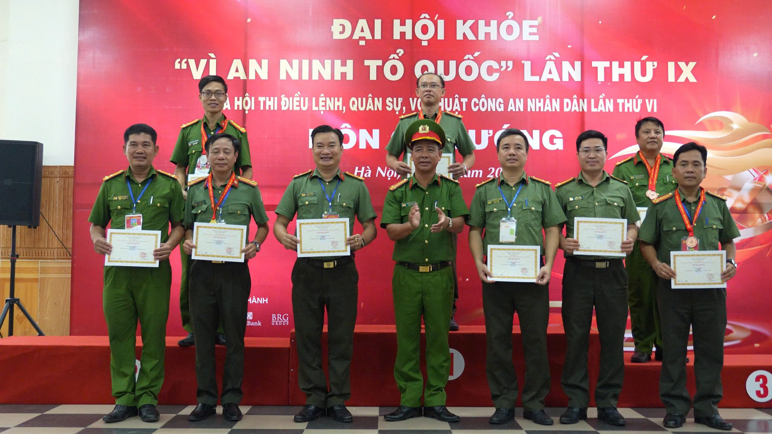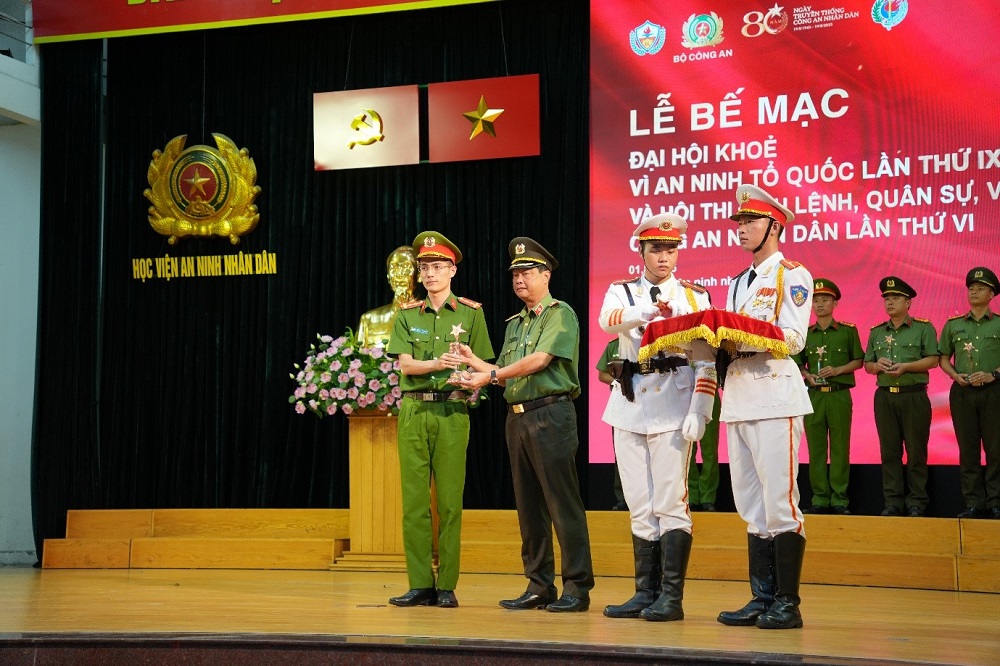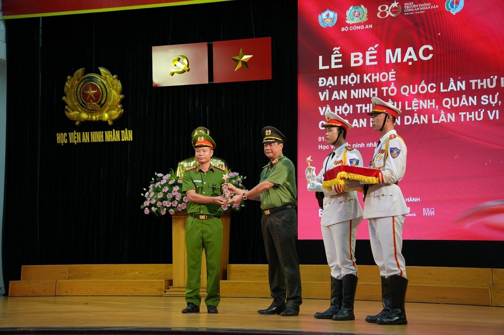 Thiếu tướng Lê Hồng Hiệp - Phó Cục trưởng Cục Công tác chính trị trao giải Nhì nội dung chỉ huy đội tuyển cho Thượng tá Phạm Lâm Hải Nguyên – Phó trưởng phòng Kỹ thuật hình sự (Đứng thứ 2 từ trái qua)