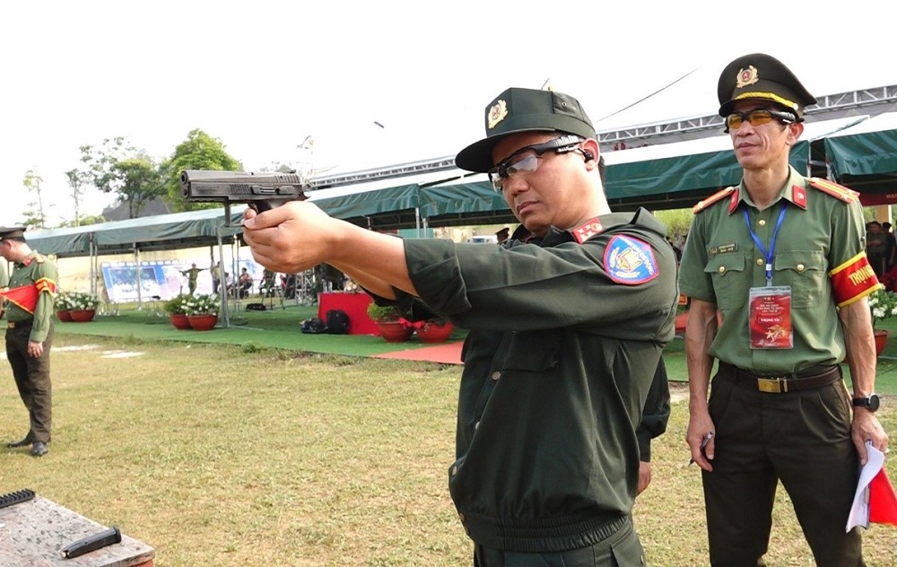 Đại tá Đậu Xuân Bảo - Ủy viên Ban thường vụ Đảng ủy, Phó Giám đốc Công an tỉnh tham gia bài bắn súng ngắn dành cho lãnh đạo
