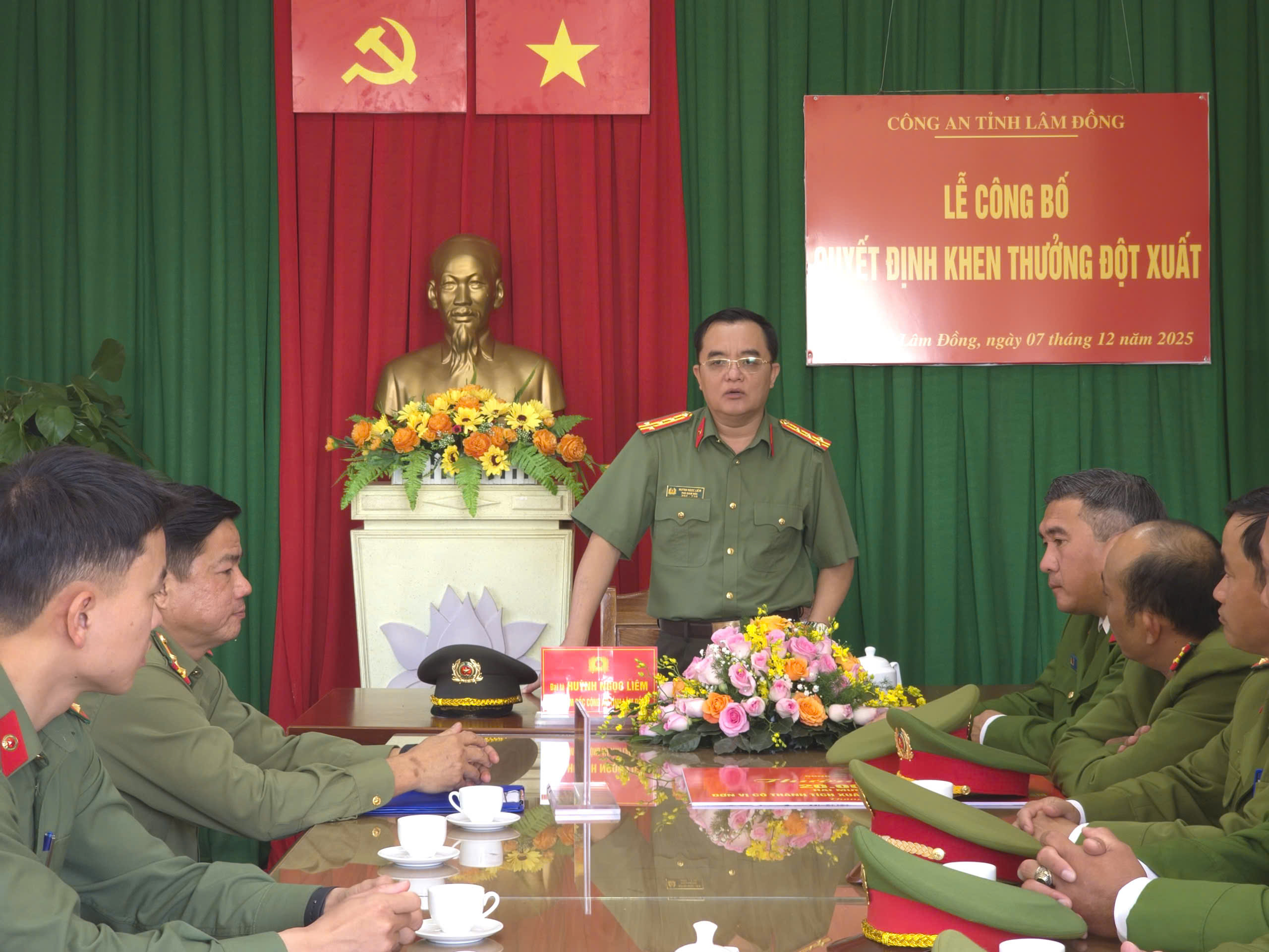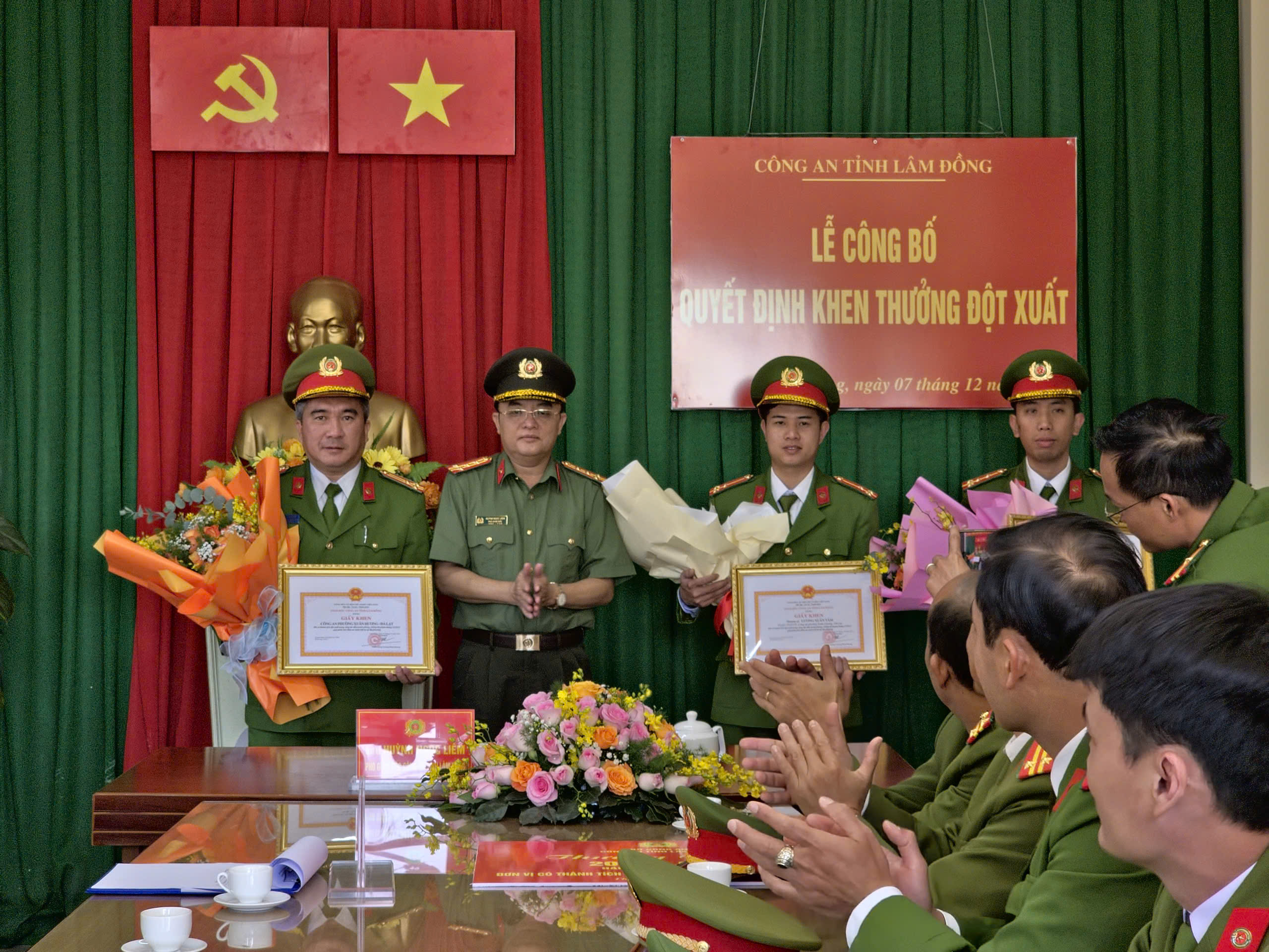 Đại tá Huỳnh Ngọc Liêm - Phó Giám đốc Công an tỉnh trao quyết định khen thưởng đột xuất cho tập thể và 2 cá nhân thuộc Công an Phường Xuân Hương - Đà Lạt