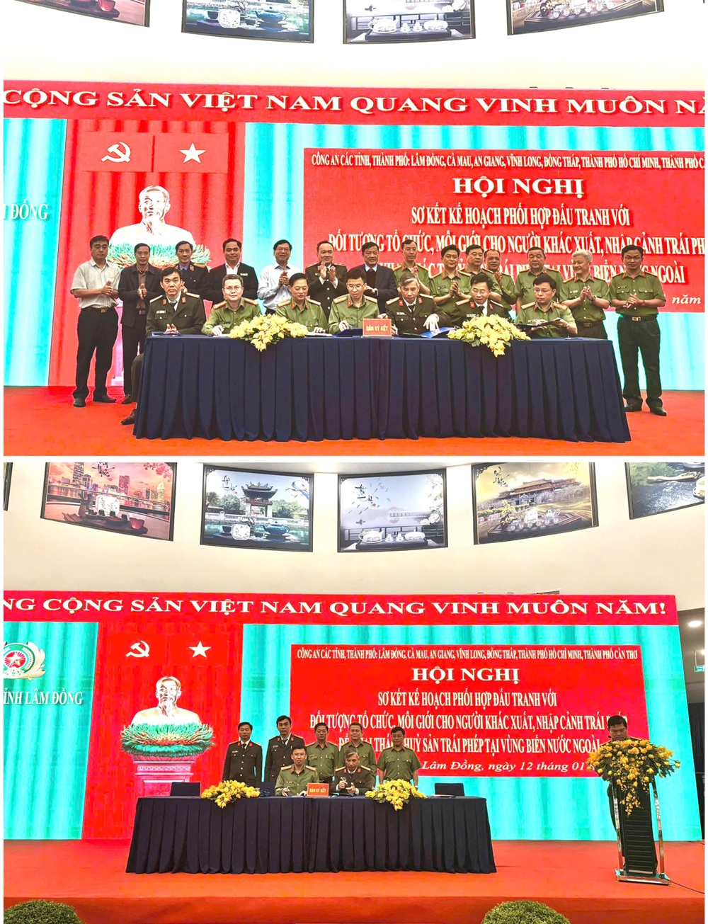 Tại hội nghị, Công an tỉnh Lâm Đồng đã ký kết bàn giao nhiệm vụ tổ chức sơ kết thực hiện Kế hoạch phối hợp đấu tranh với các đối tượng tổ chức, môi giới cho người khác xuất, nhập cảnh trái phép để khai thác thủy sản trái phép tại vùng biển nước ngoài cho Công an thành phố Cần Thơ vào kỳ hội nghị tiếp theo.