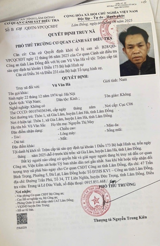 Đối tượng Vũ Văn Hà (SN 1974) thường trú tại xã Nam Ban, tỉnh Lâm Đồng bị truy nã theo Quyết định số B578/QĐTN-VPCQCSĐT ngày 20/6/2025 của Cơ quan Cảnh sát điều tra Công an tỉnh Lâm Đồng về tội “Trộm cắp tài sản”.