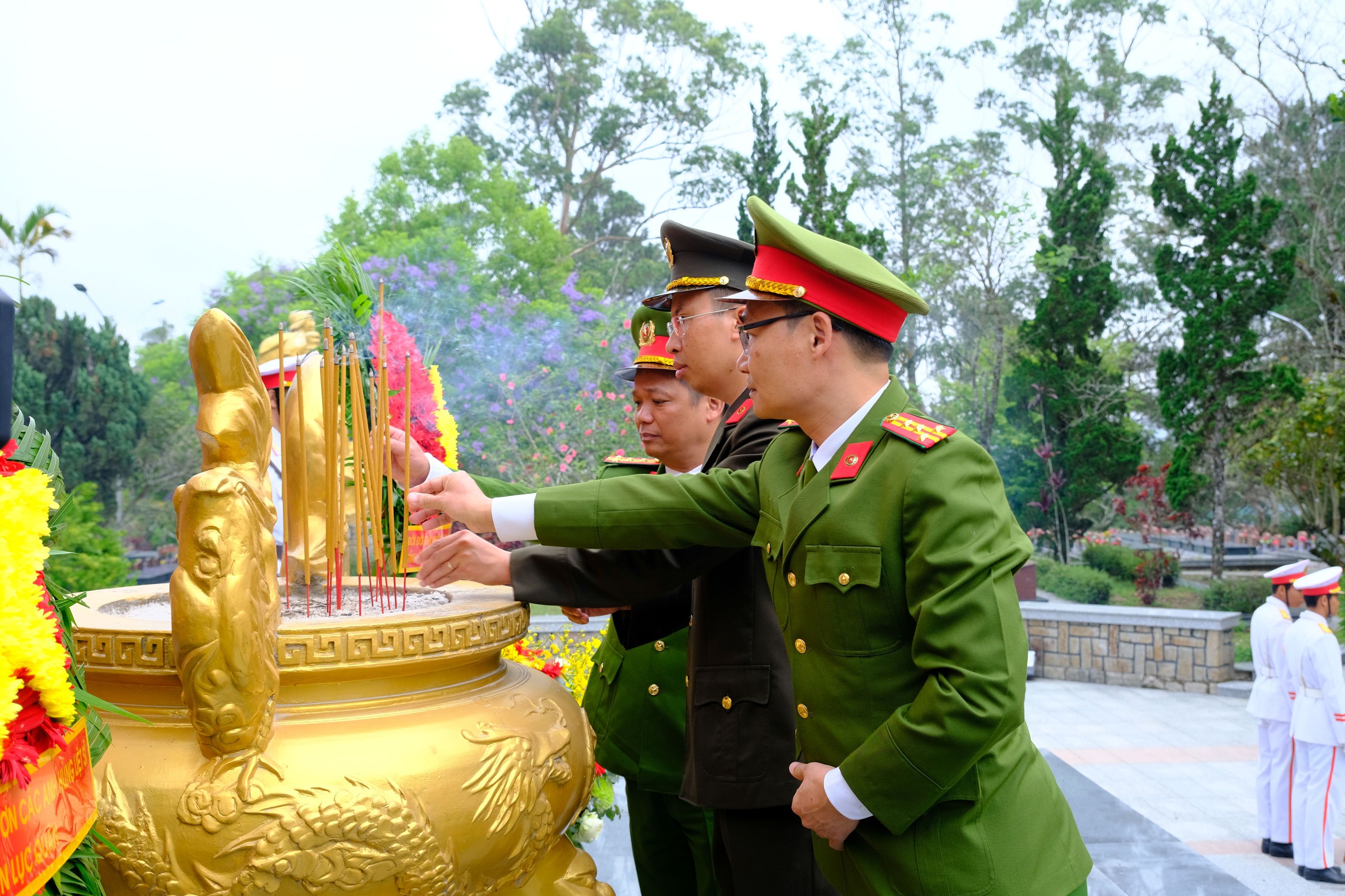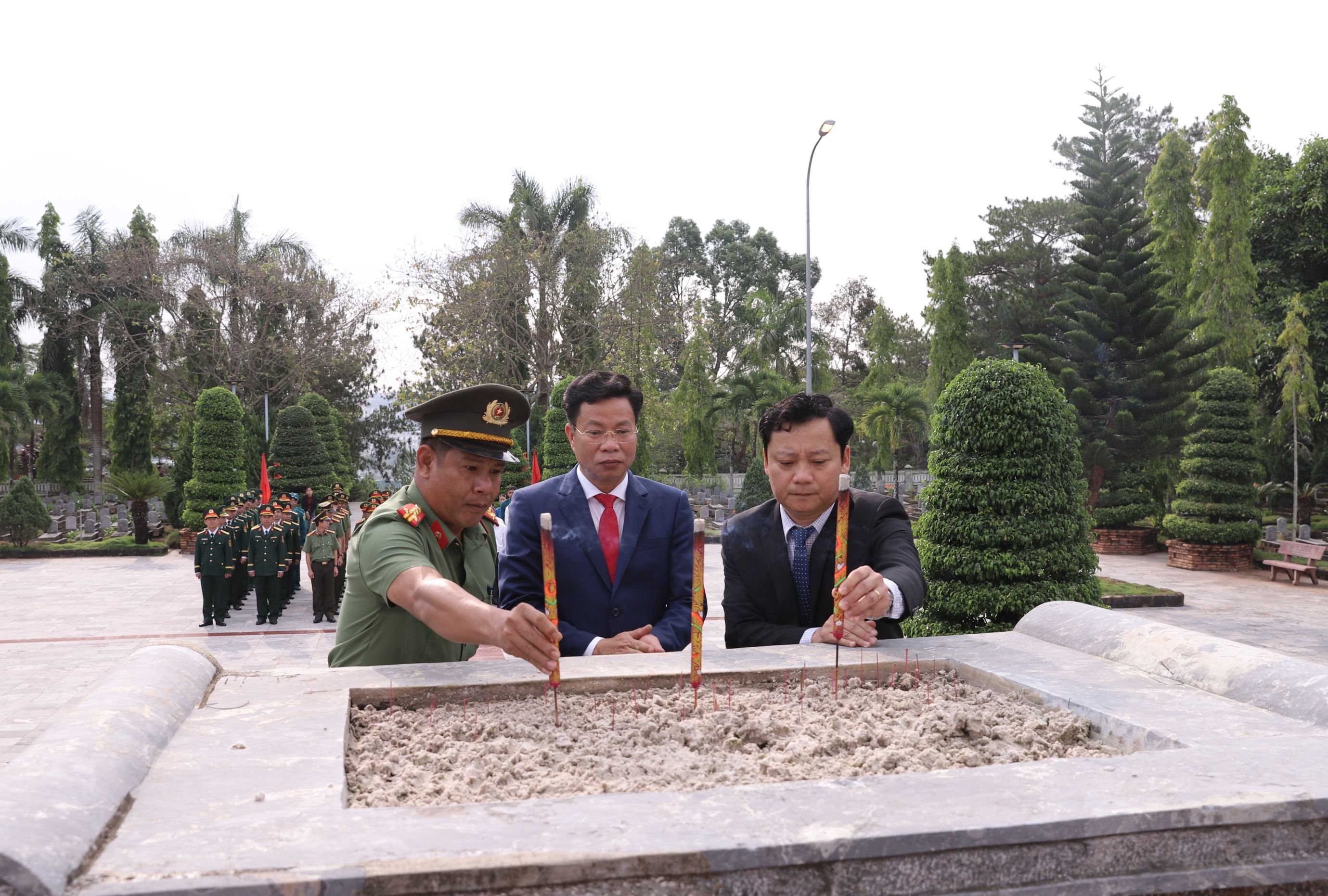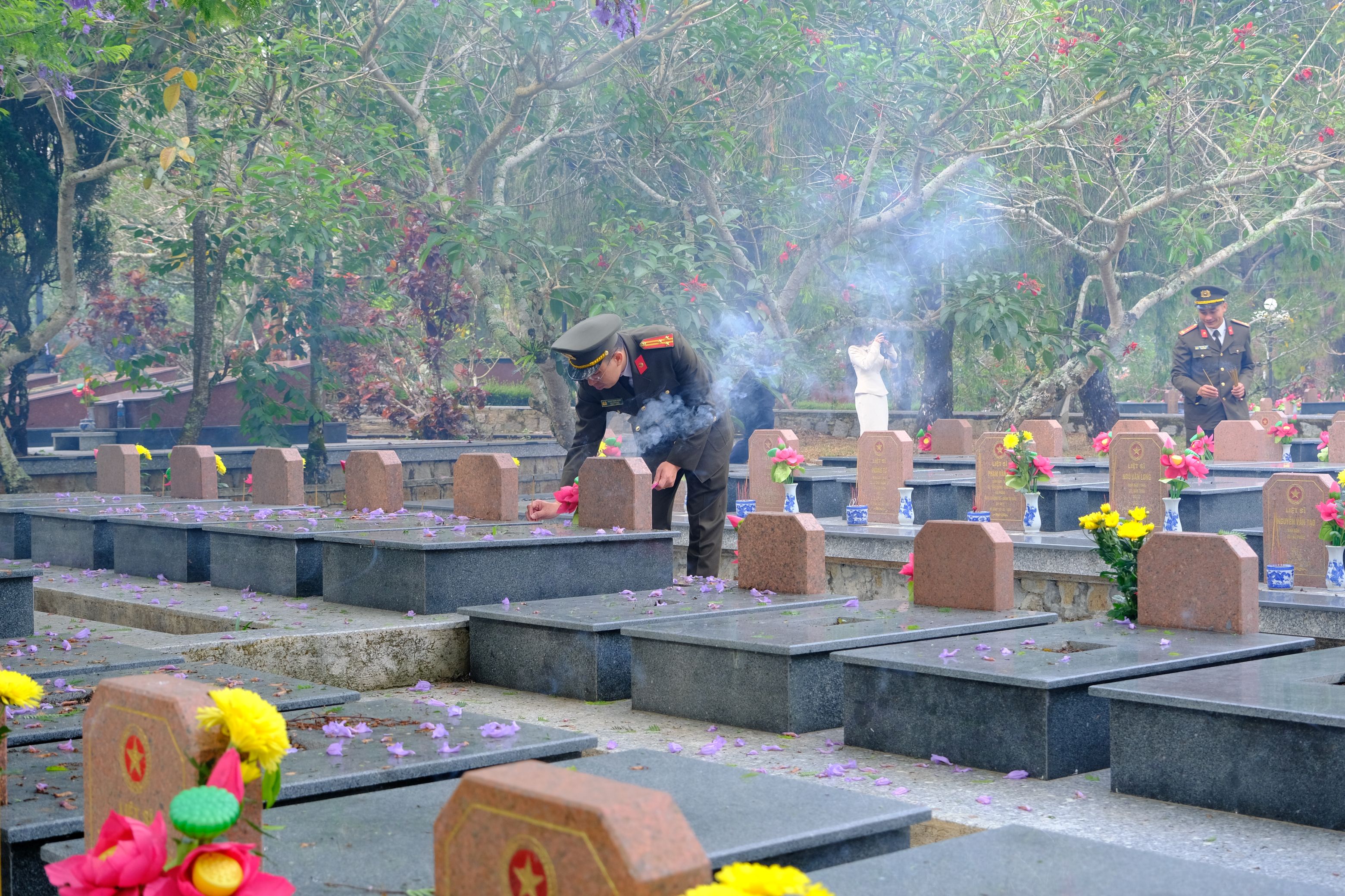 Ngay sau lễ viếng, các đồng chí lãnh đạo, đại diện các sở, ngành, địa phương và các lực lượng vũ trang đã thắp những nén hương lên mộ phần các anh hùng liệt sĩ.