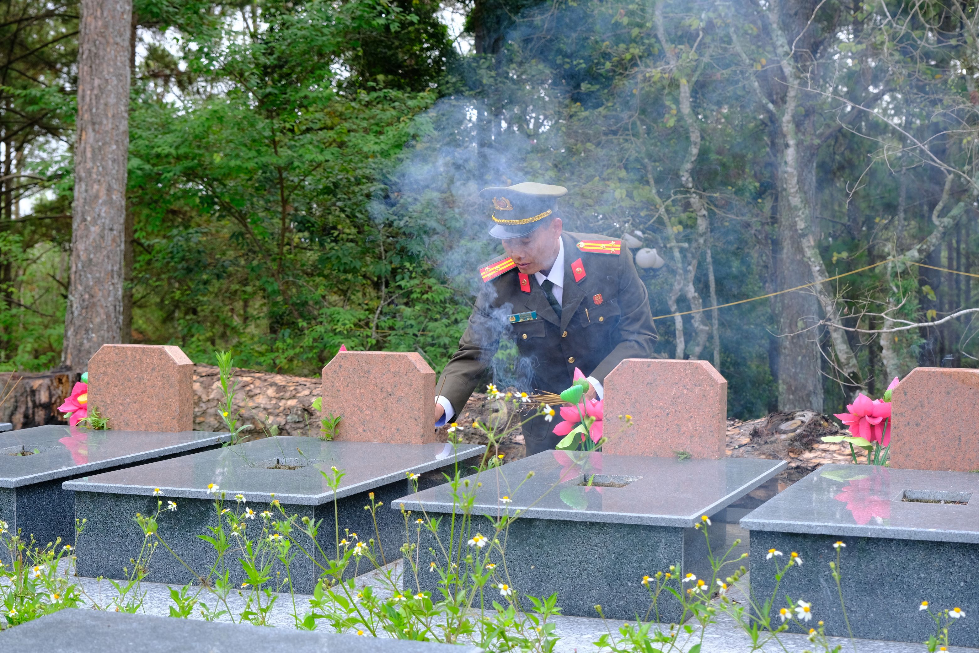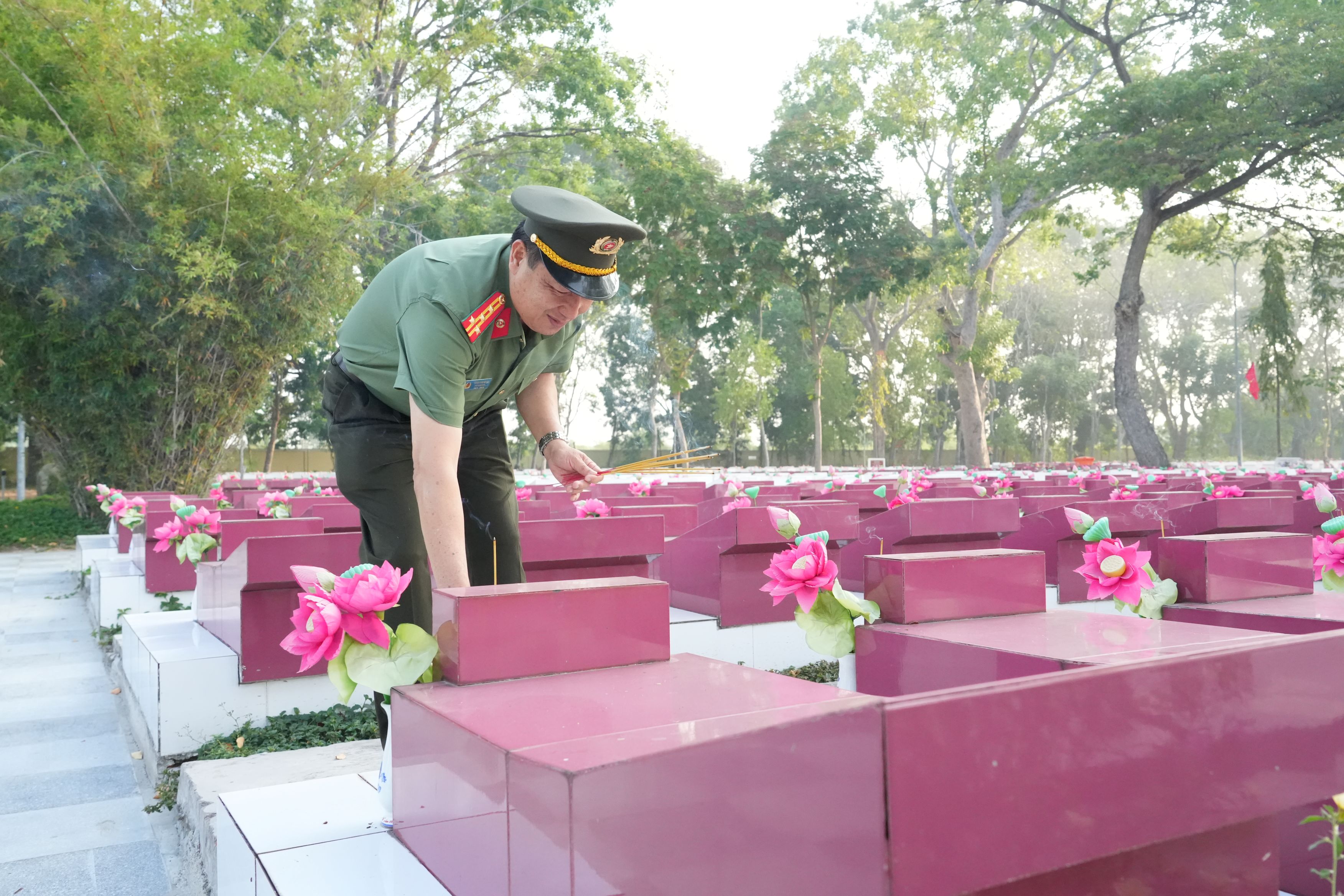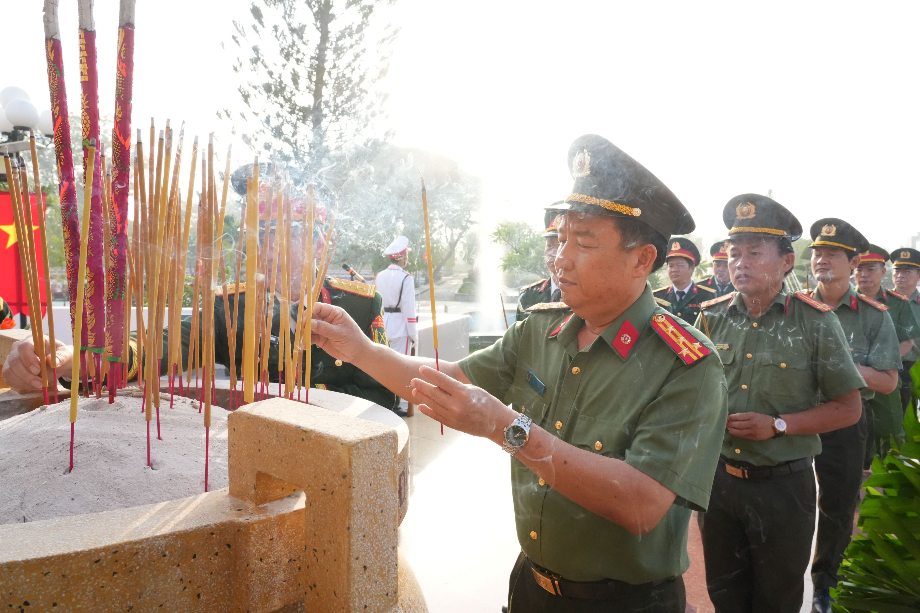 Ngay sau lễ viếng, các đồng chí lãnh đạo, đại diện các sở, ngành, địa phương và các lực lượng vũ trang đã thắp những nén hương lên mộ phần các anh hùng liệt sĩ.